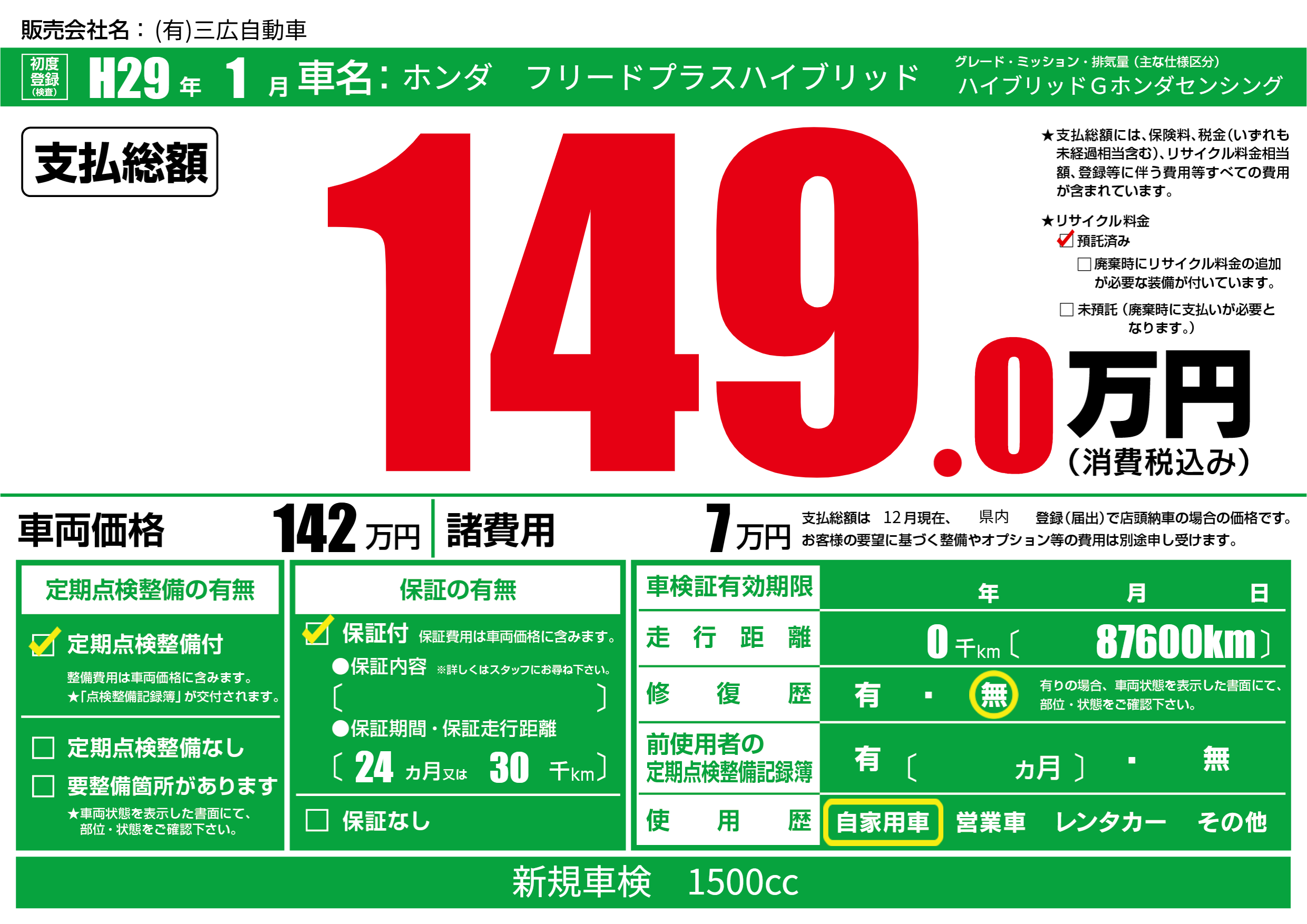 | 車名 | ホンダ フリードプラスハイブリッド | グレード ミッション 排気量 |
