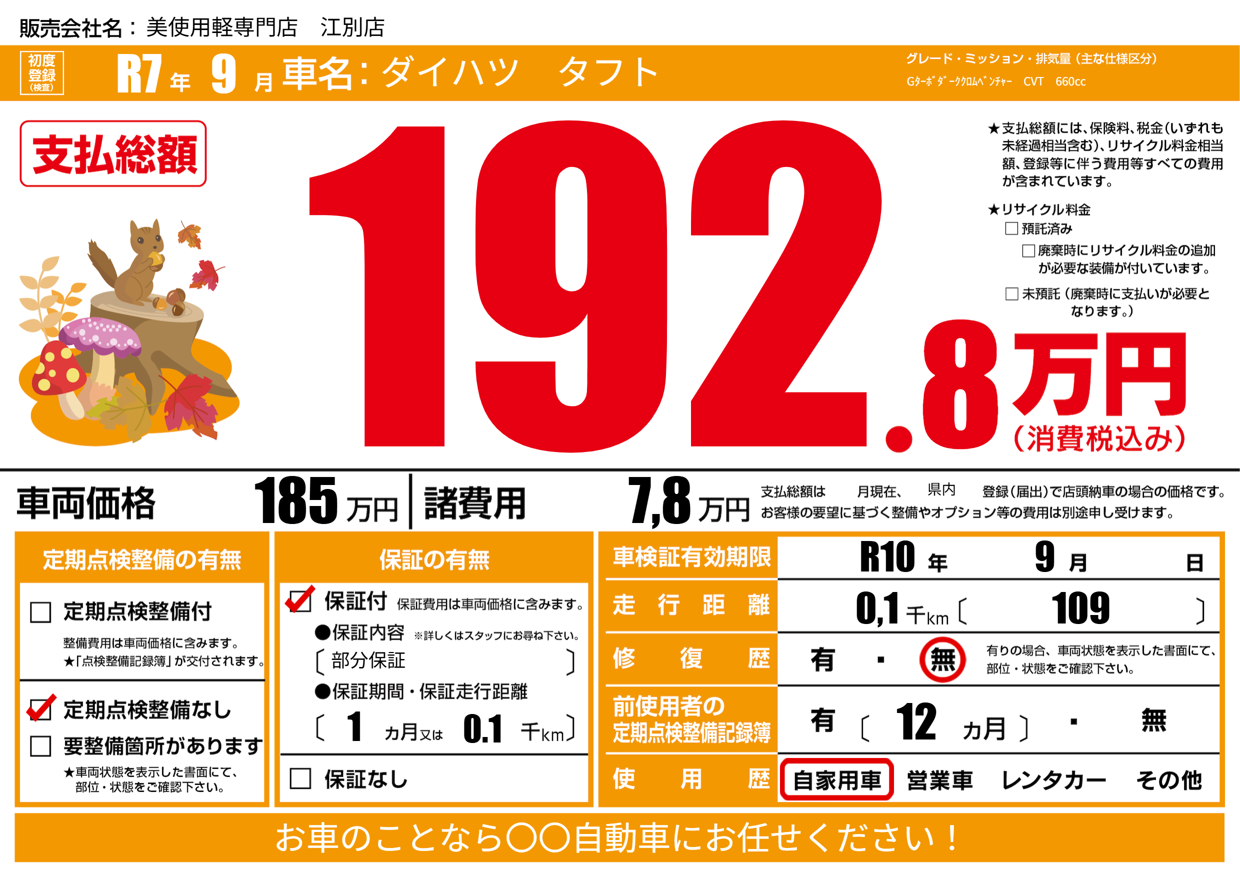 | 走行キロ | - | 初年度登録 | R7年9月 |
