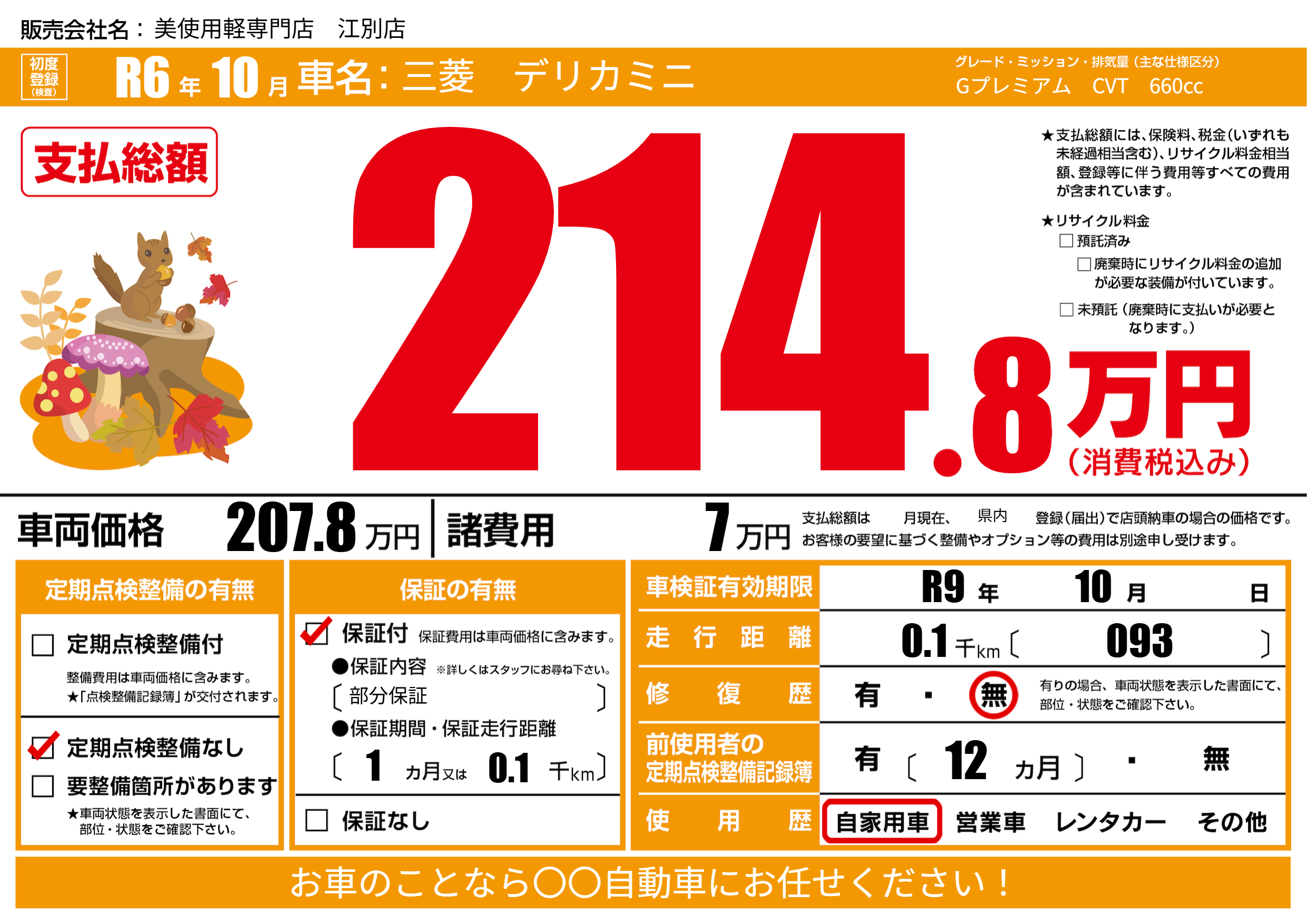 | 車検制限 | R9年 10月 - 日 | ||