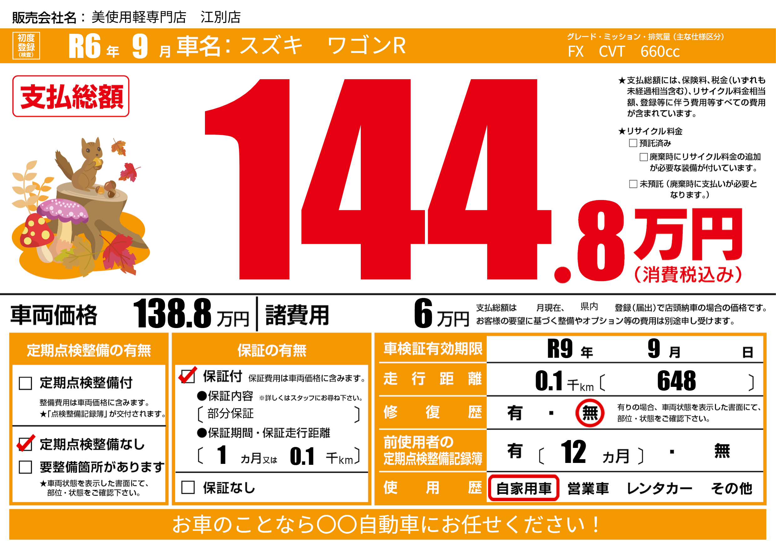 | 走行キロ | - | 初年度登録 | R6年9月 |