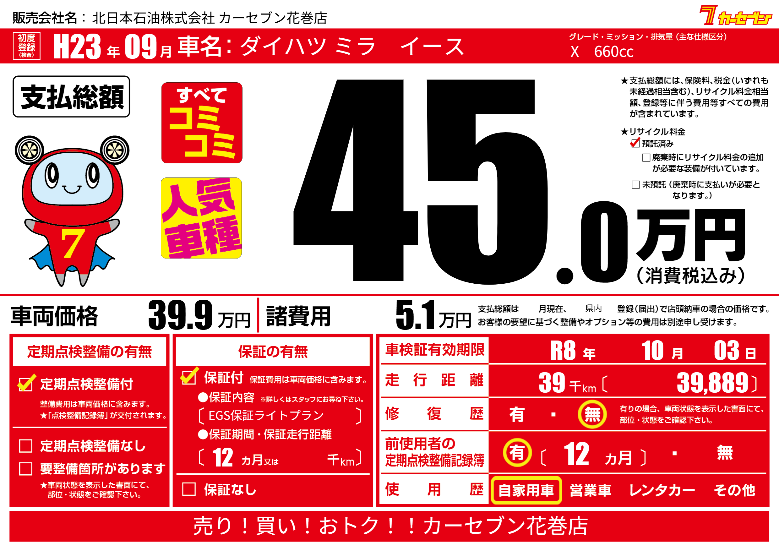 | 走行キロ | 3.9万km | 初年度登録 | H23年09月 |