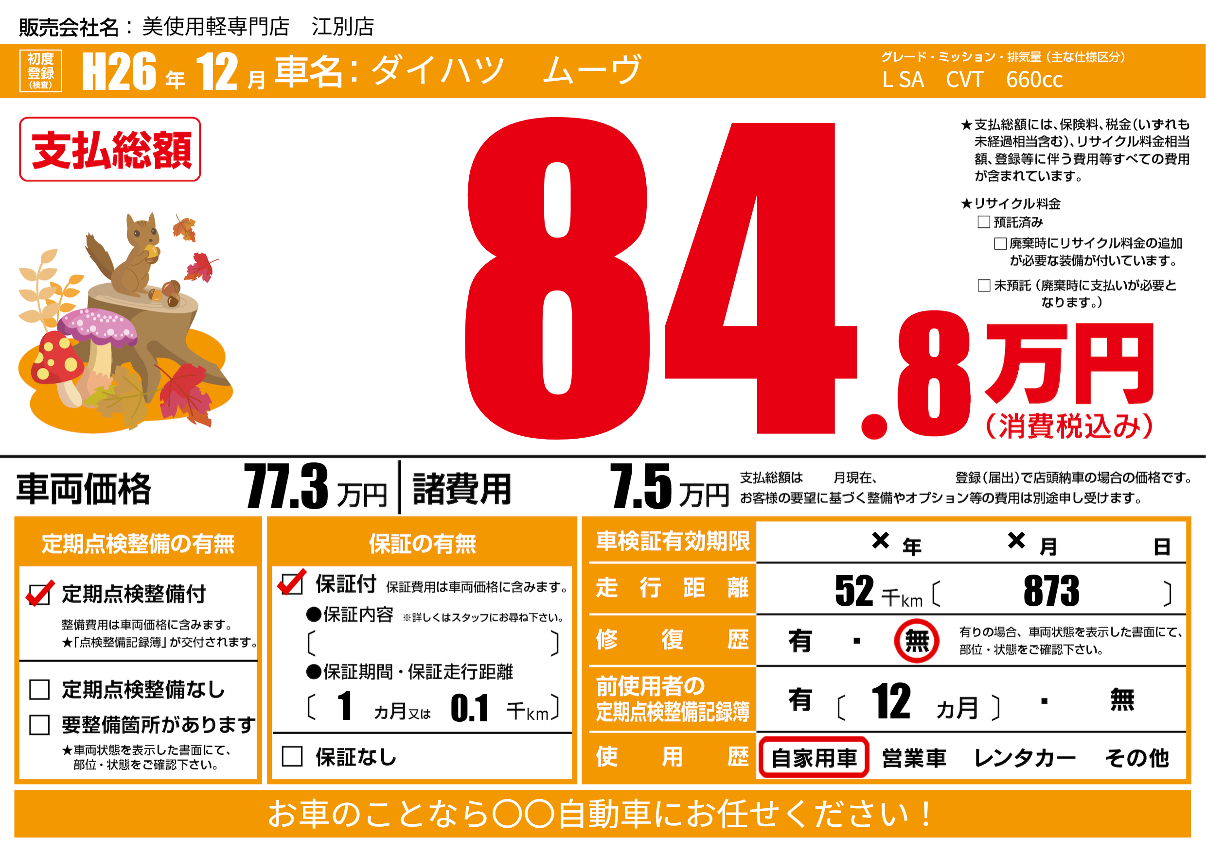 | 走行キロ | 5.2万km | 初年度登録 | H26年12月 |