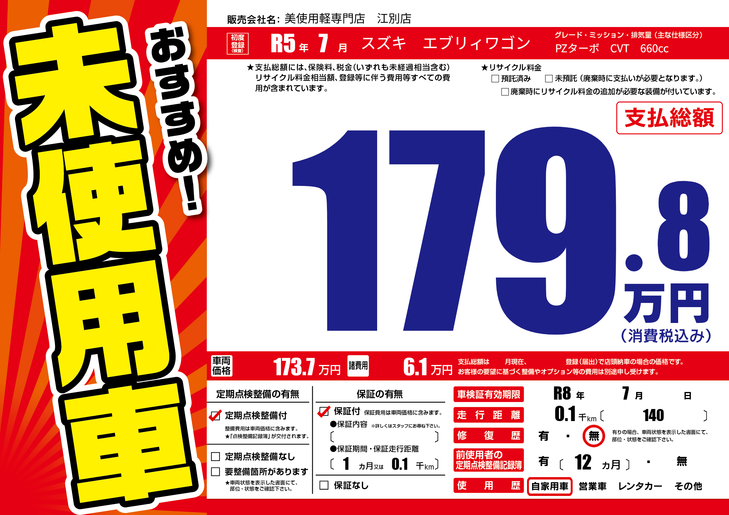 | 車名 | スズキ エブリィワゴン | グレード ミッション 排気量 |