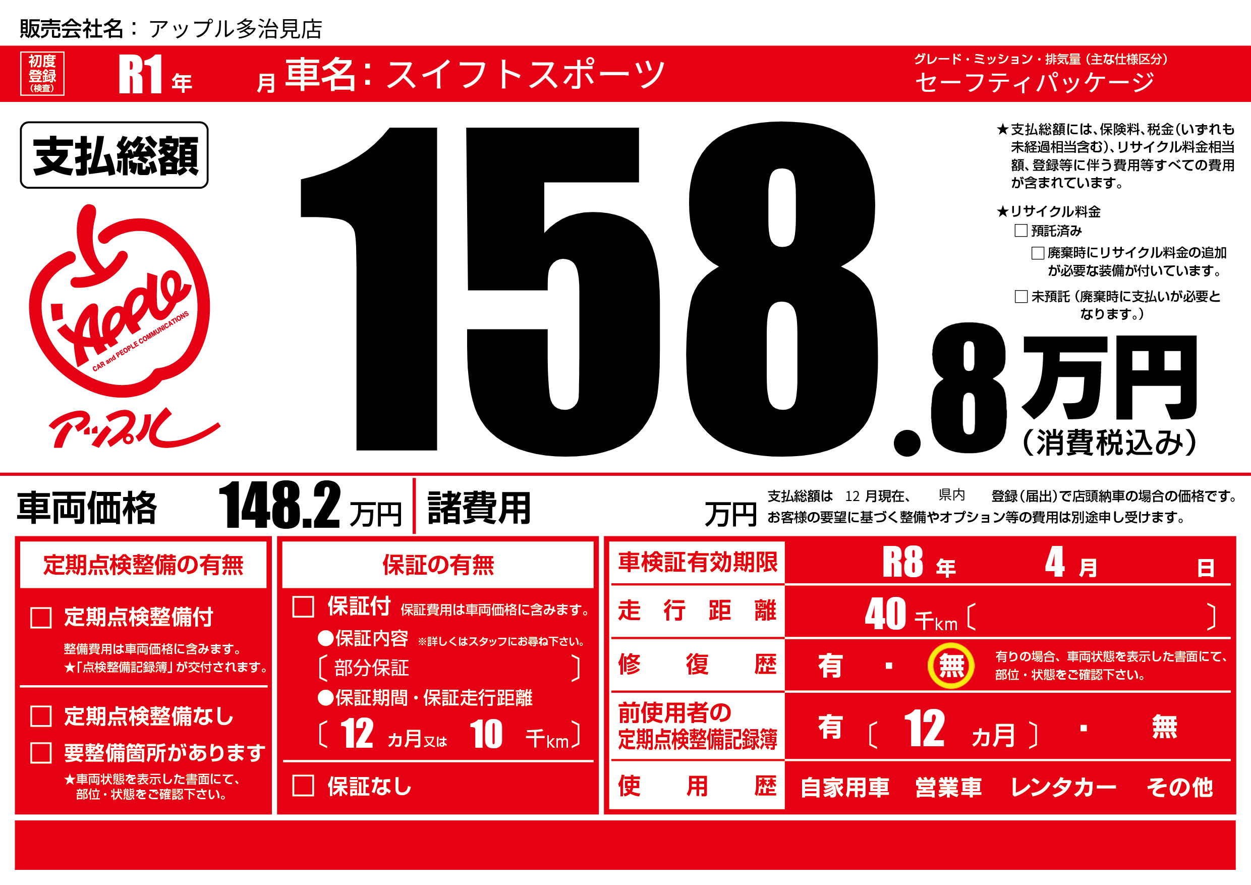 | 車名 | スイフトスポーツ | グレード ミッション 排気量 |