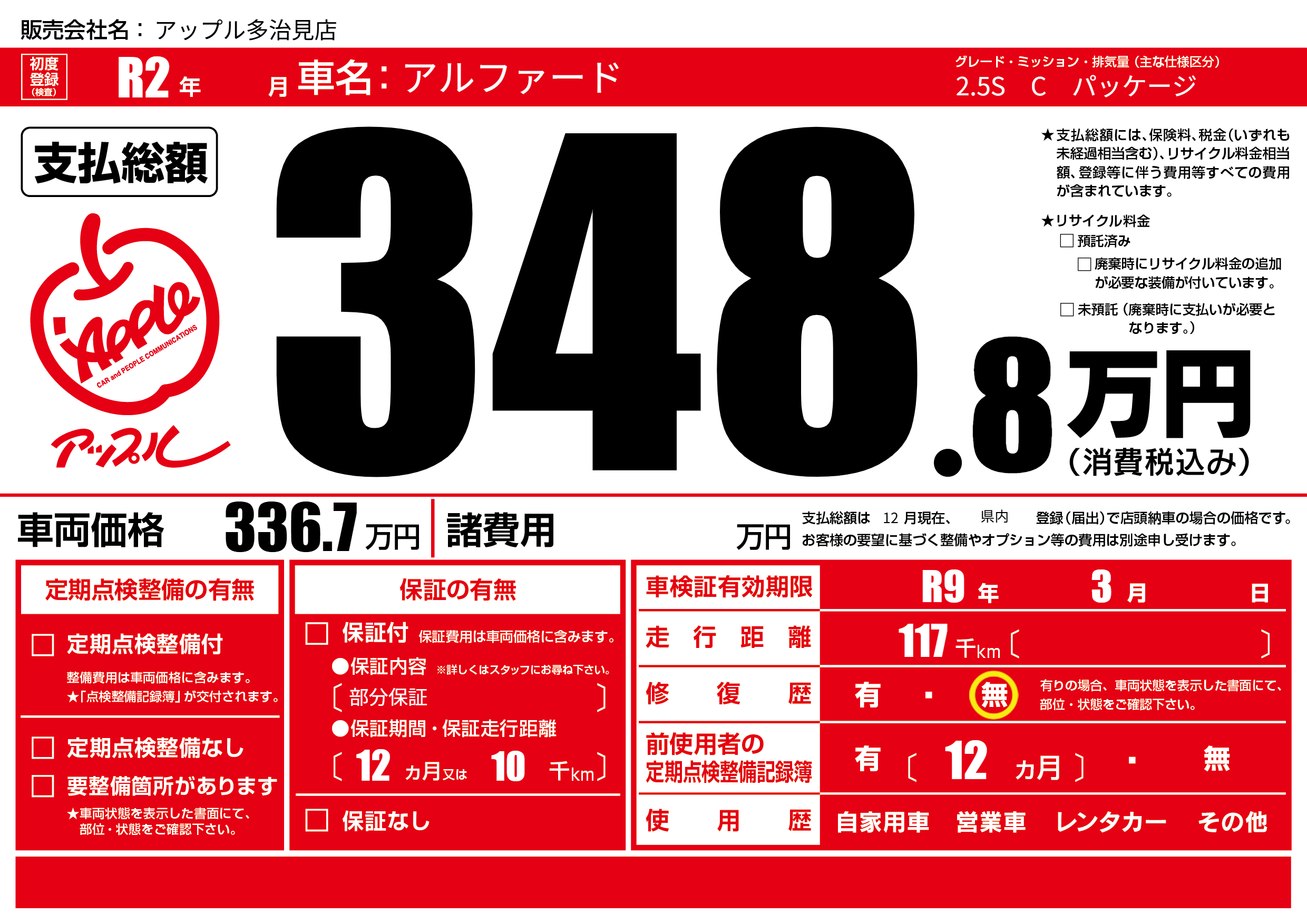 | 車検制限 | R9年 3月 - 日 | ||