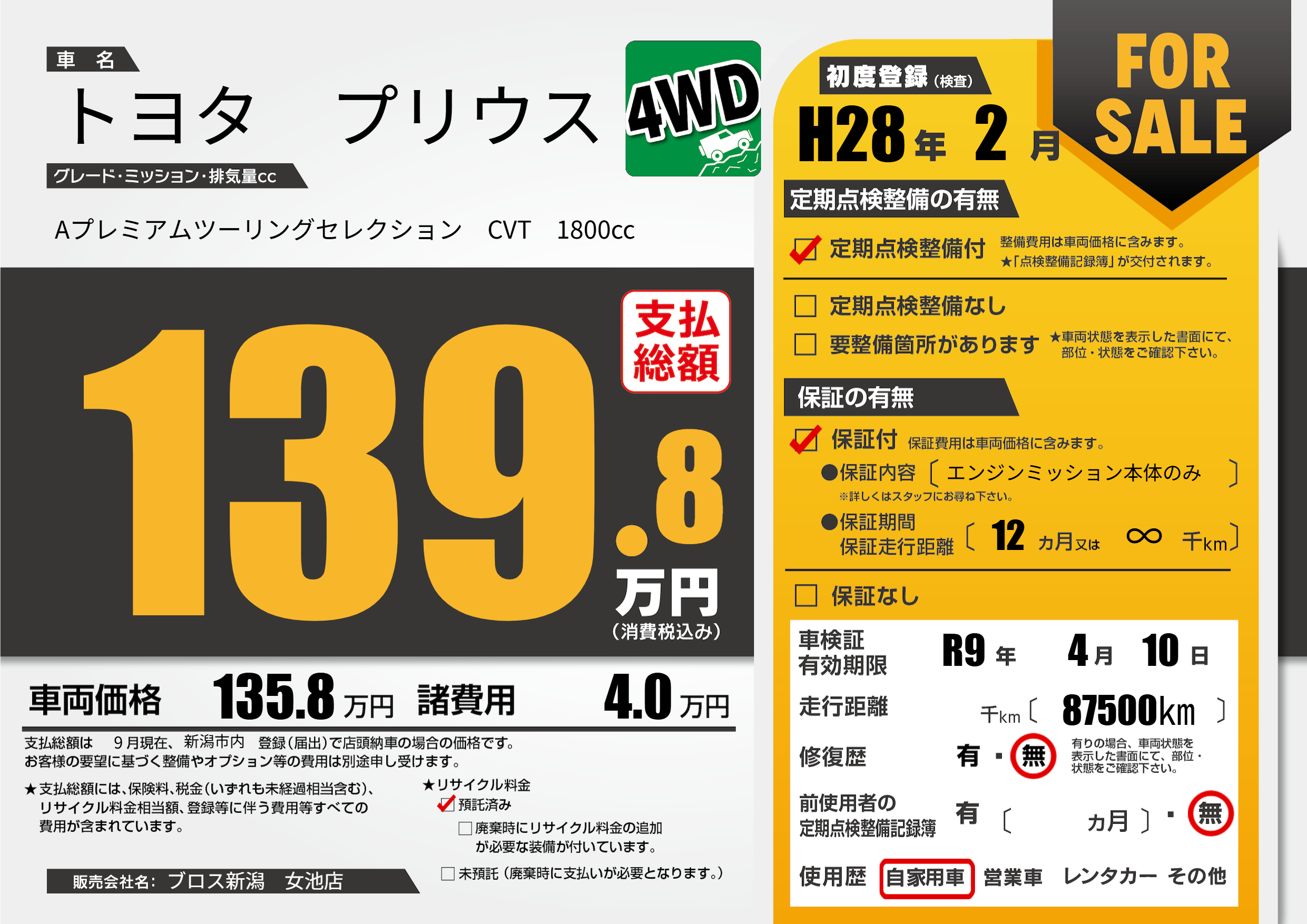 | 車名 | トヨタ プリウス | グレード ミッション 排気量 |