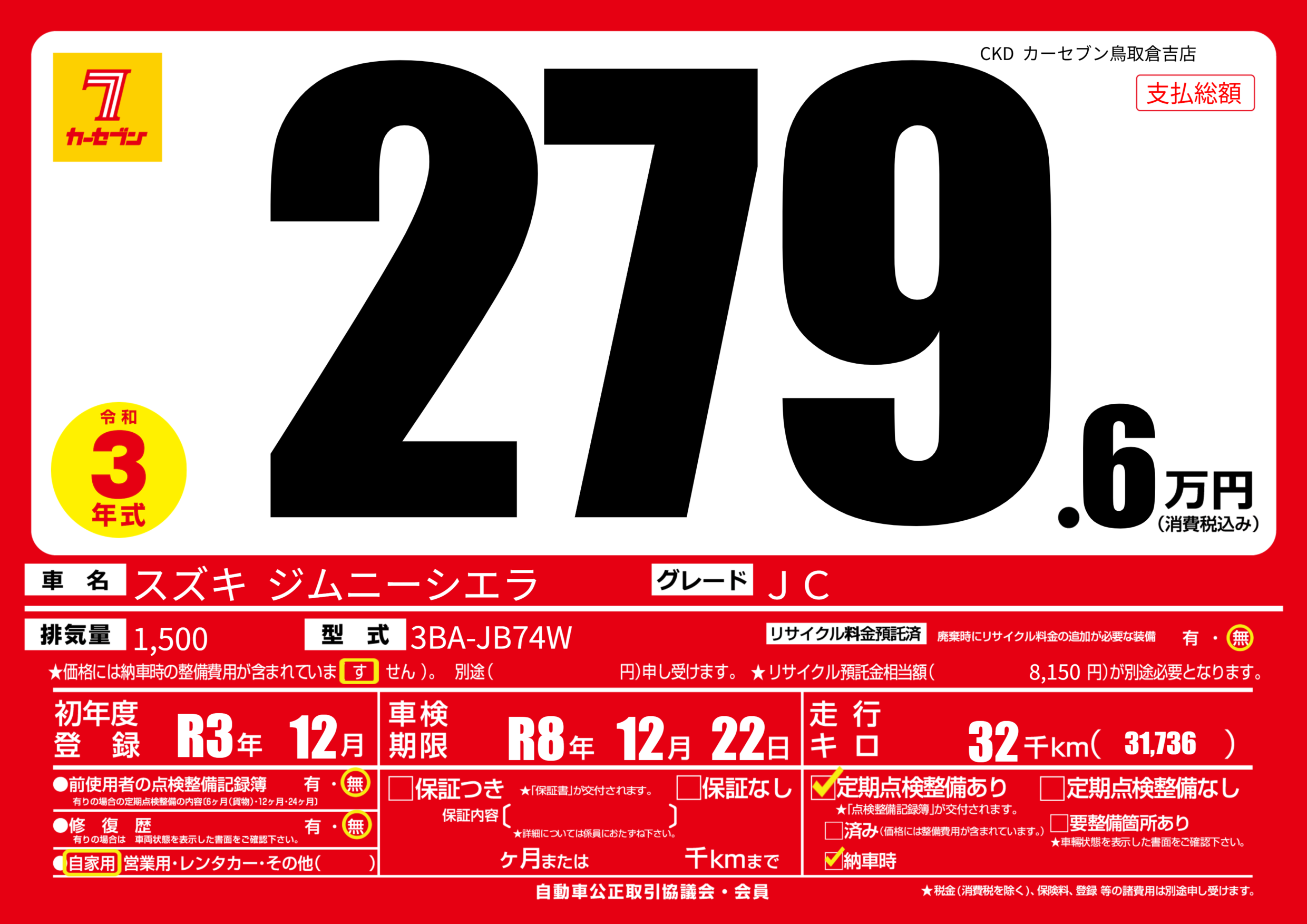 | 走行キロ | 3.2万km | 初年度登録 | R3年12月 |