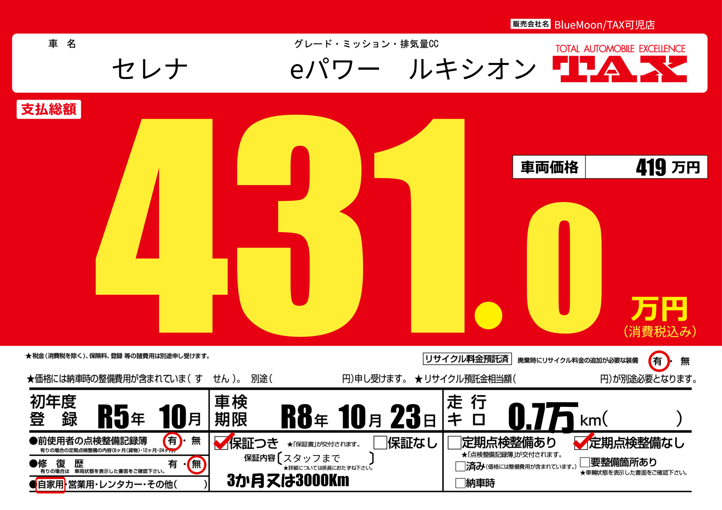 | 走行キロ | - | 初年度登録 | R5年10月 |