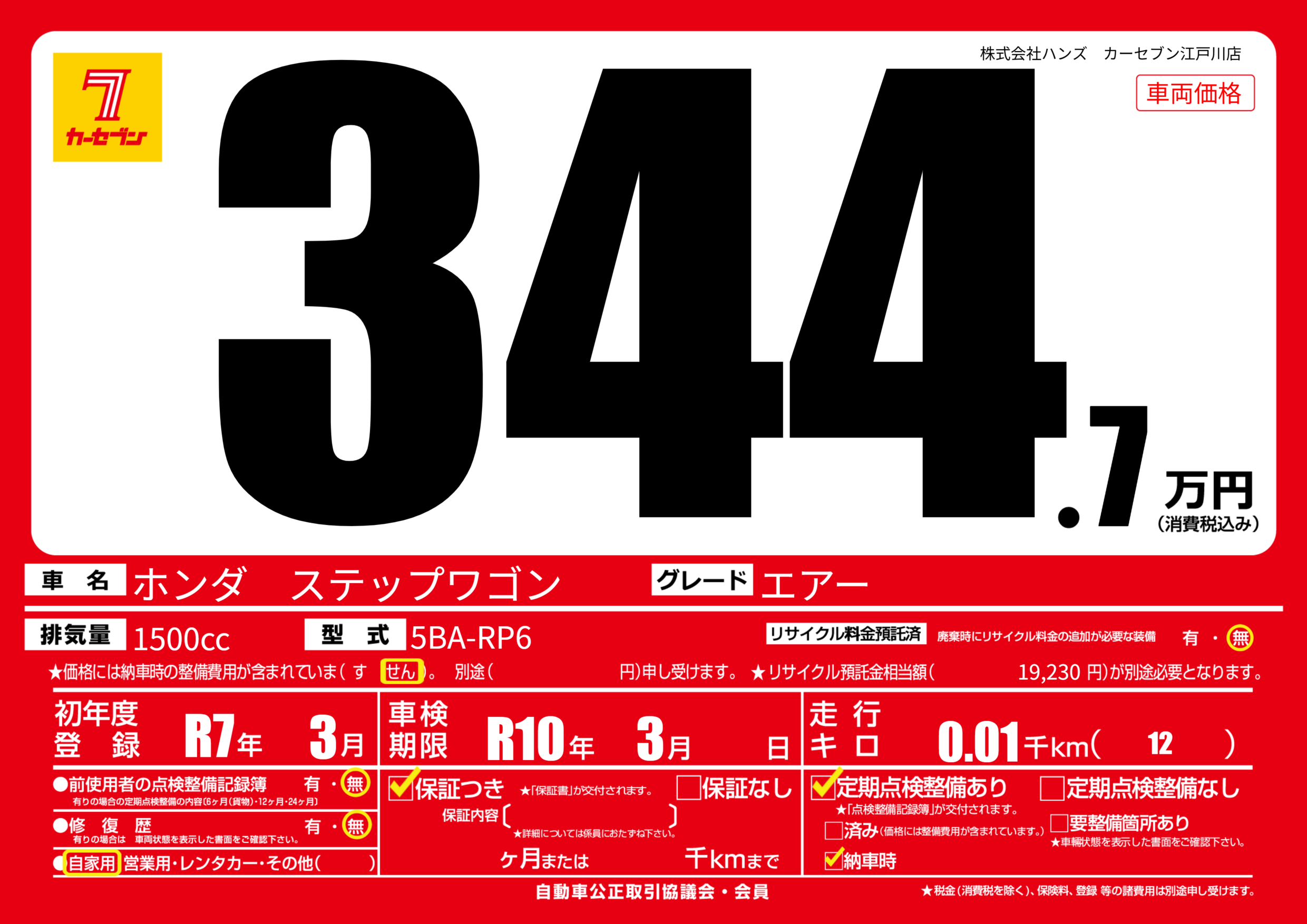 | 車名 | ホンダ ステップワゴン | グレード ミッション 排気量 |