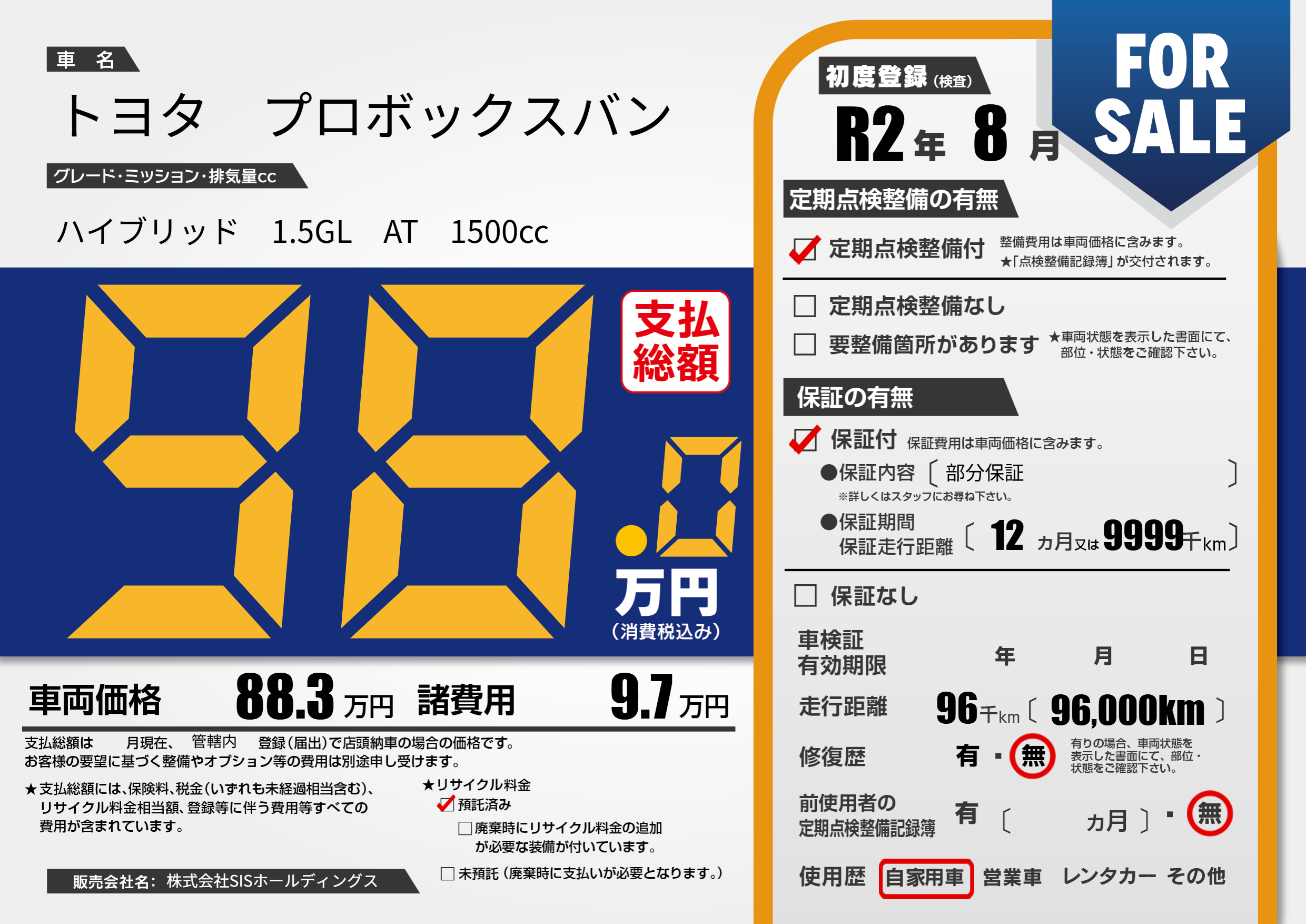 | 車名 | トヨタ プロボックスバン | グレード ミッション 排気量 |