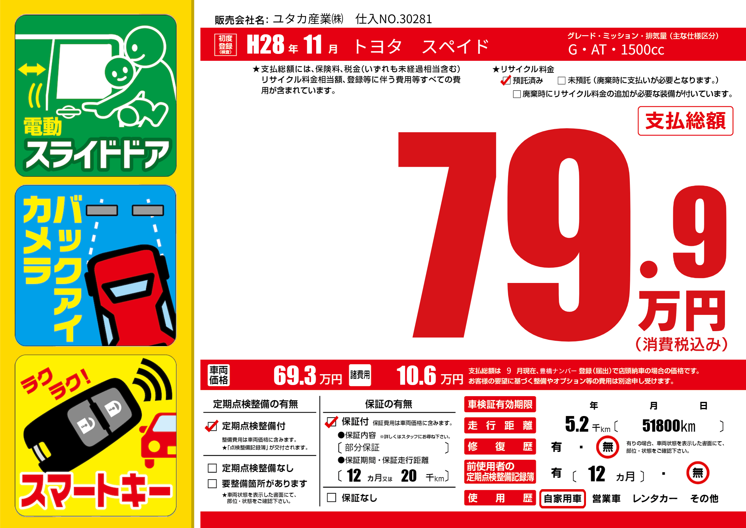 | 車名 | トヨタ スペイド | グレード ミッション 排気量 |
