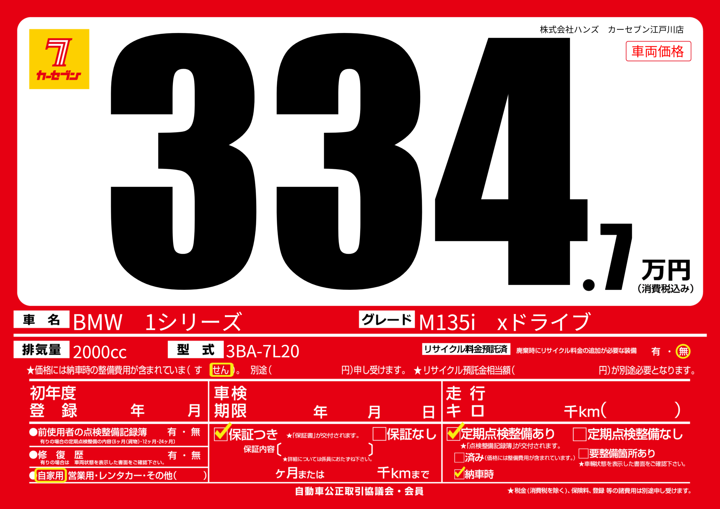 | 車名 | BMW 1シリーズ | グレード ミッション 排気量 |