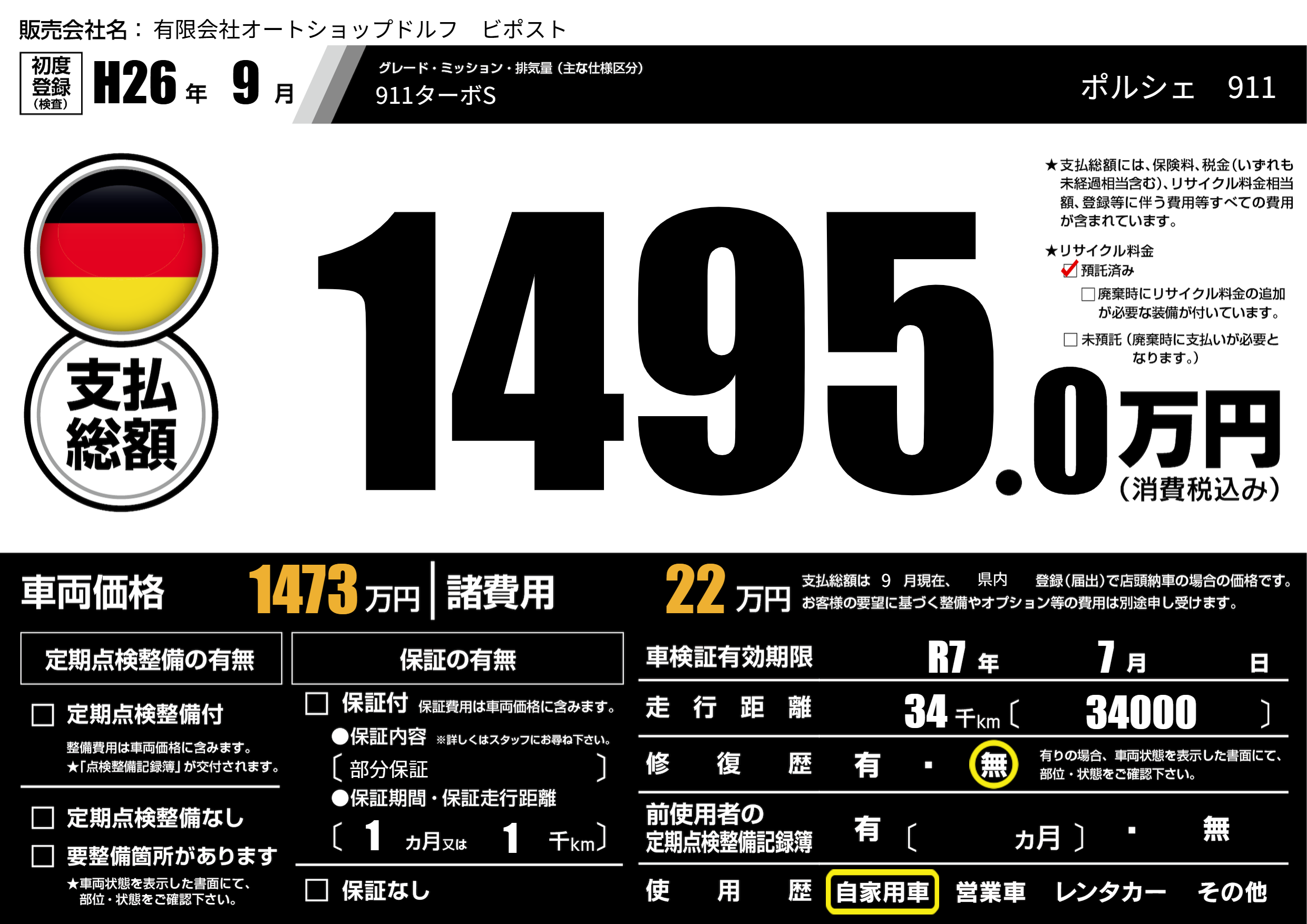 | 車名 | ポルシェ 911 | グレード ミッション 排気量 |