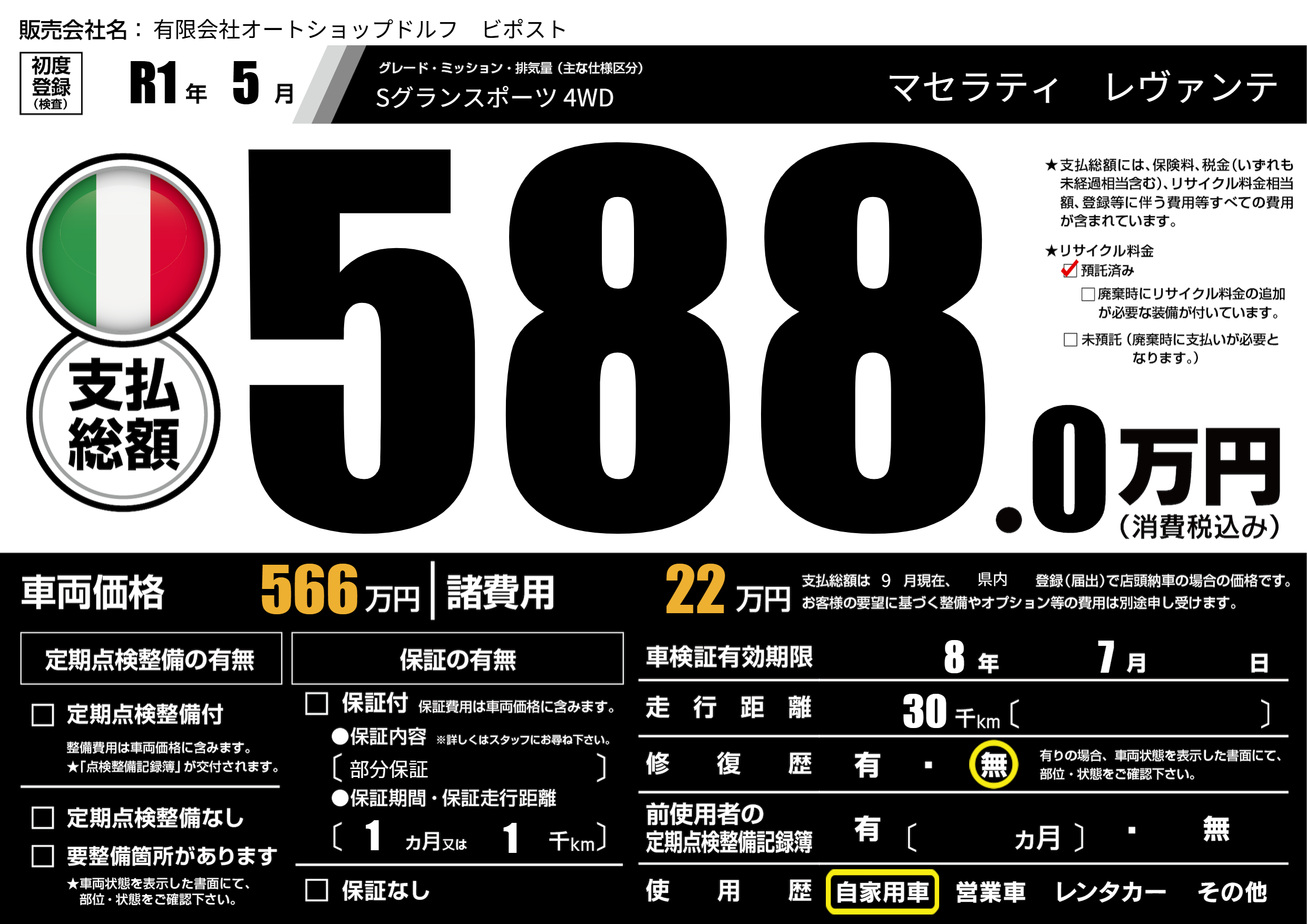 | 車名 | マセラティ レヴァンテ | グレード ミッション 排気量 |