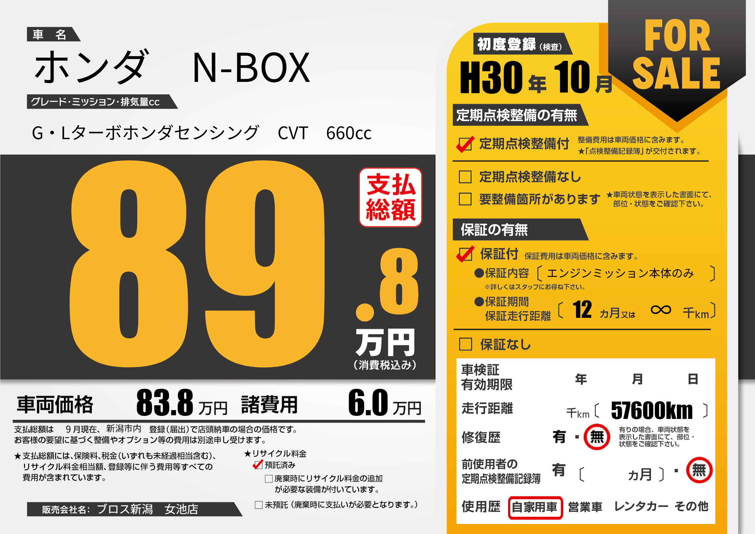| 車名 | ホンダ N-BOX | グレード ミッション 排気量 |
