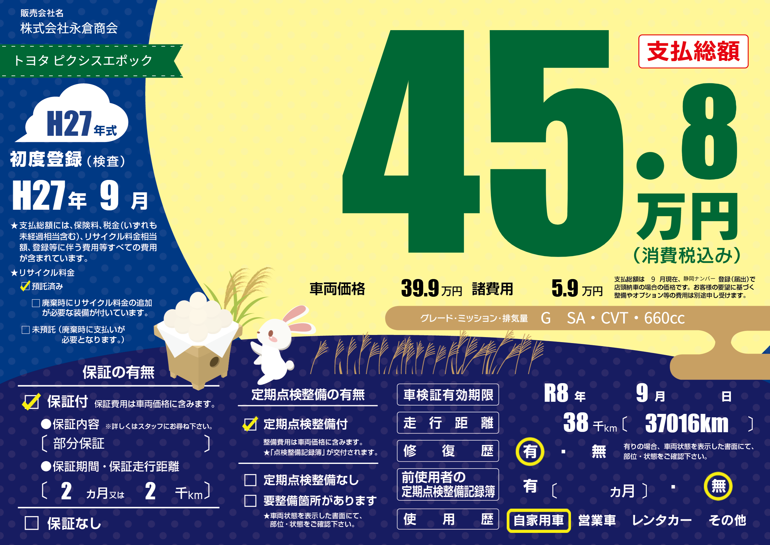 | 走行キロ | 3.8万km | 初年度登録 | H27年9月 |