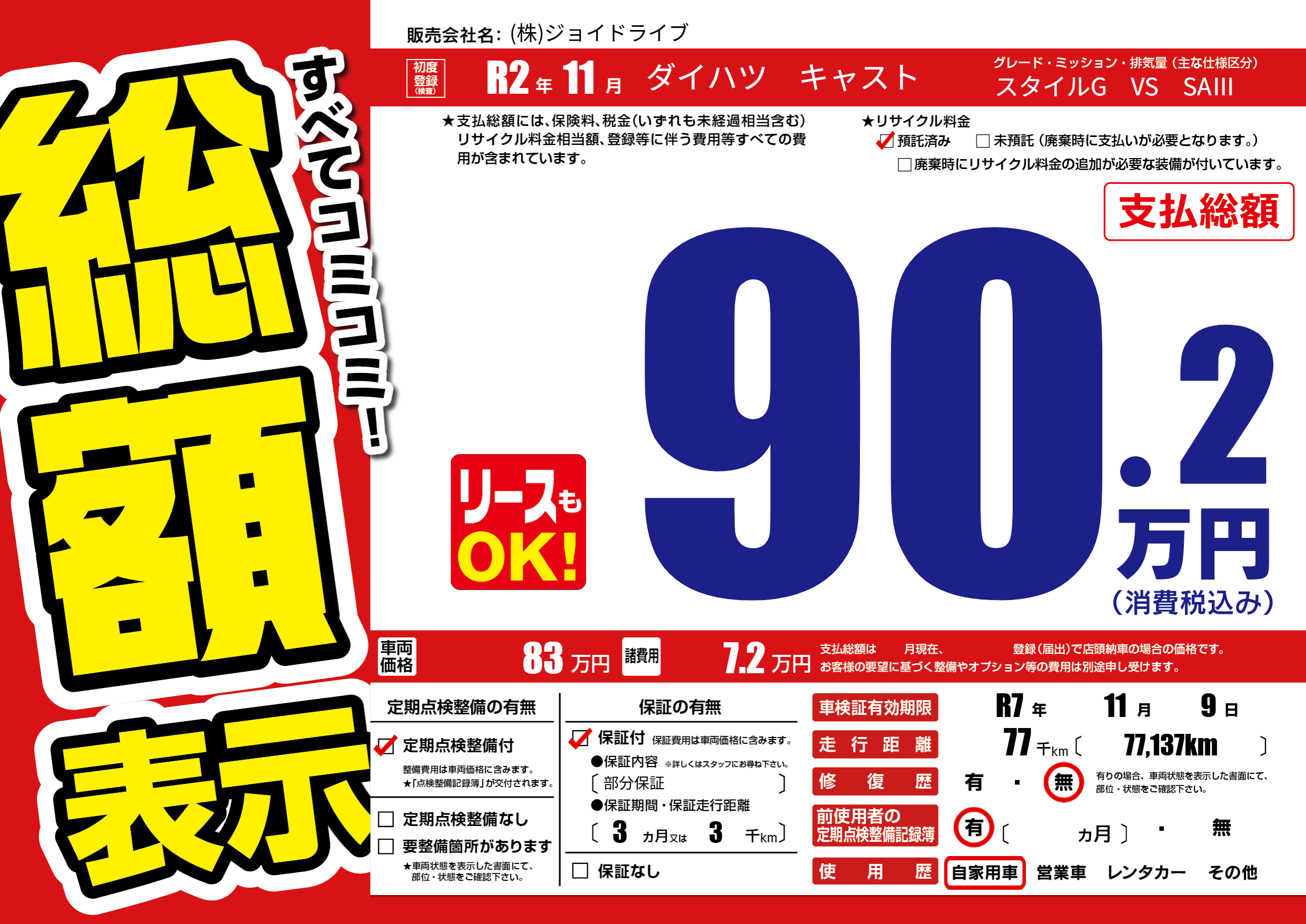 | 走行キロ | 7.7万km | 初年度登録 | R2年11月 |