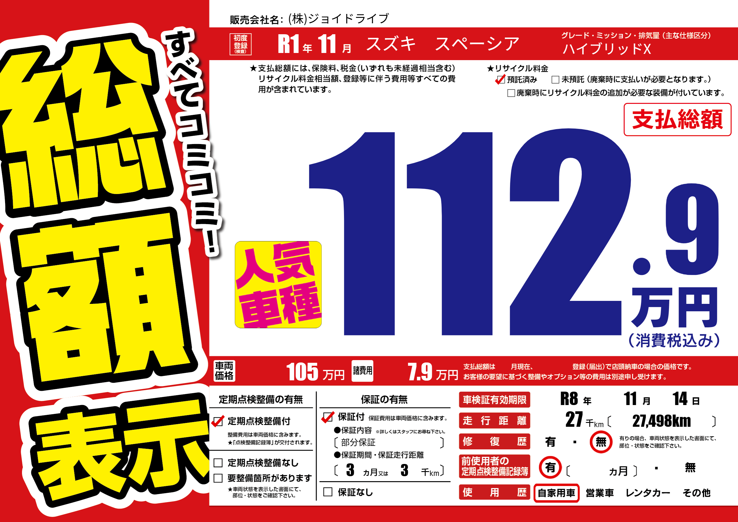 | 走行キロ | 2.7万km | 初年度登録 | R1年11月 |
