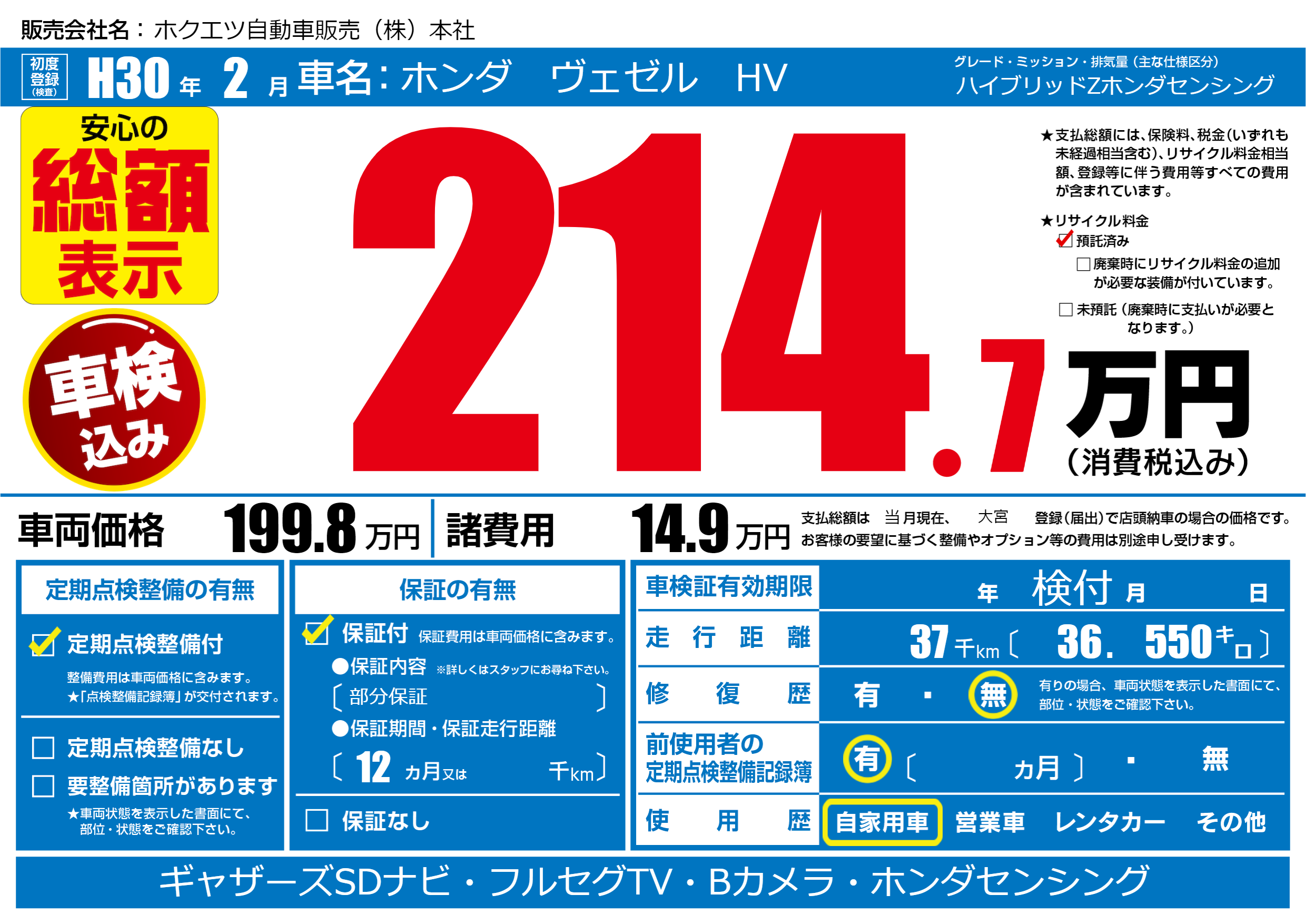 | 車名 | ホンダ ヴェゼル HV | グレード ミッション 排気量 |
