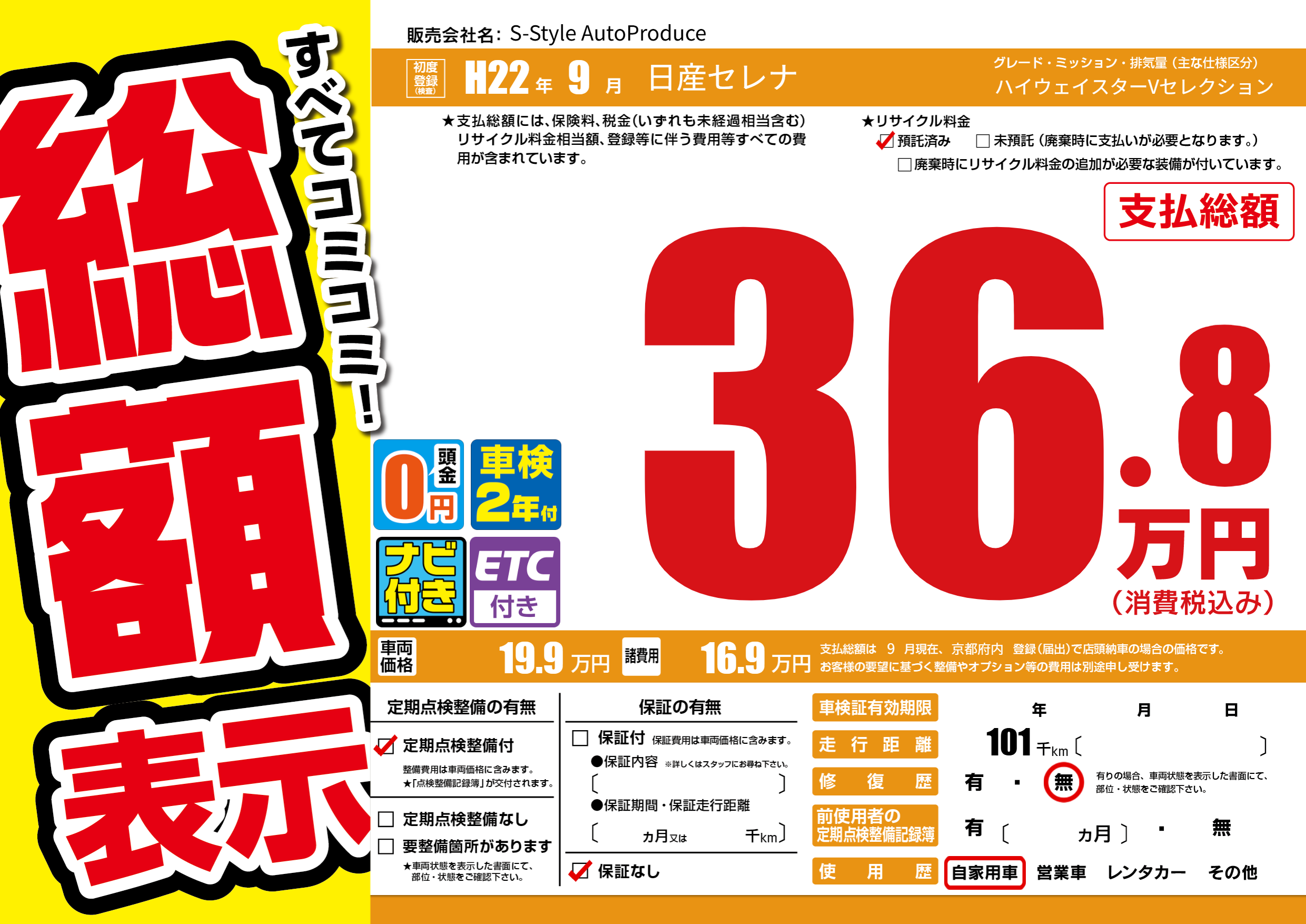 | 走行キロ | 10.1万km | 初年度登録 | H22年9月 |
