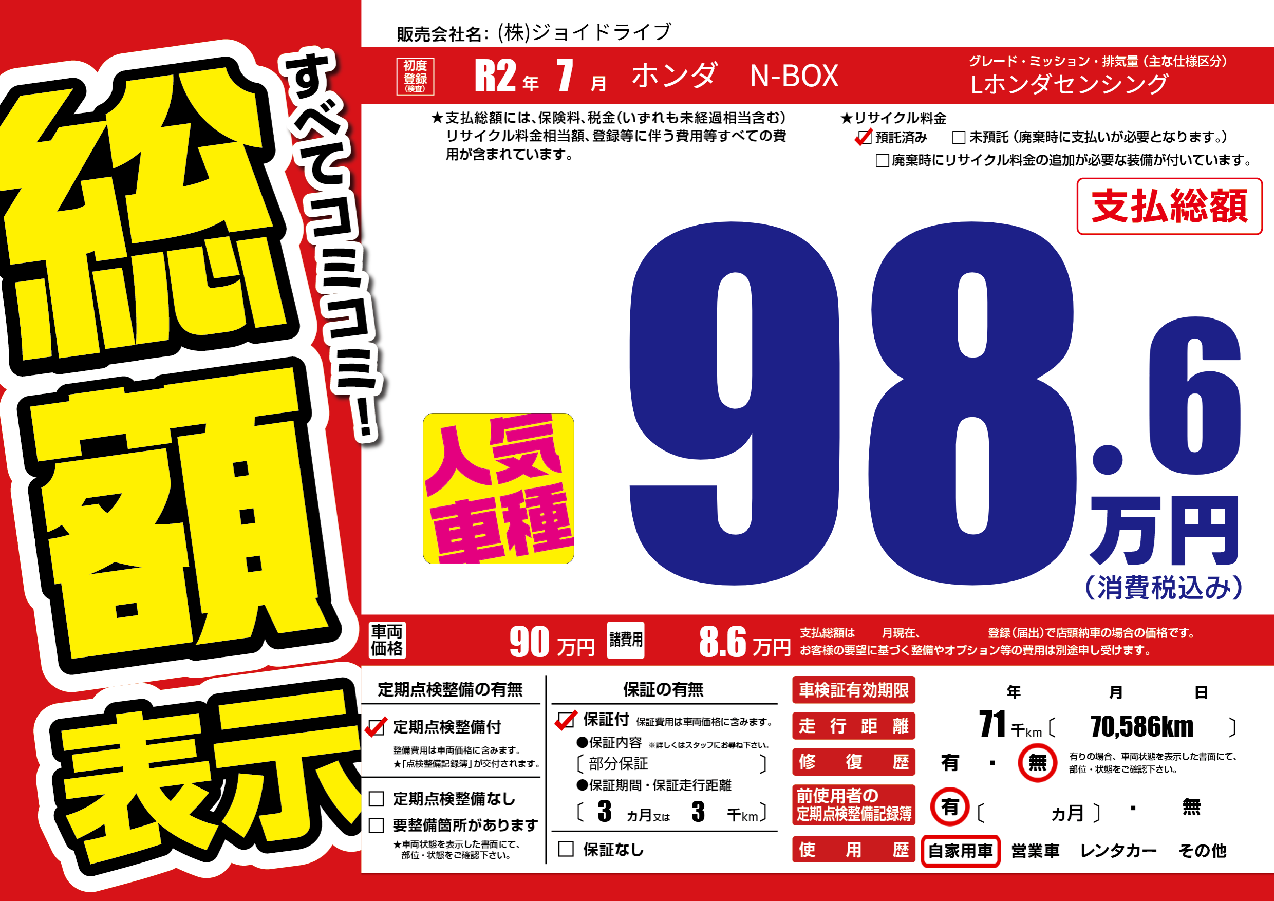 保証付き 保証内容(部分保証) 3ヶ月または(3)千kmまで |