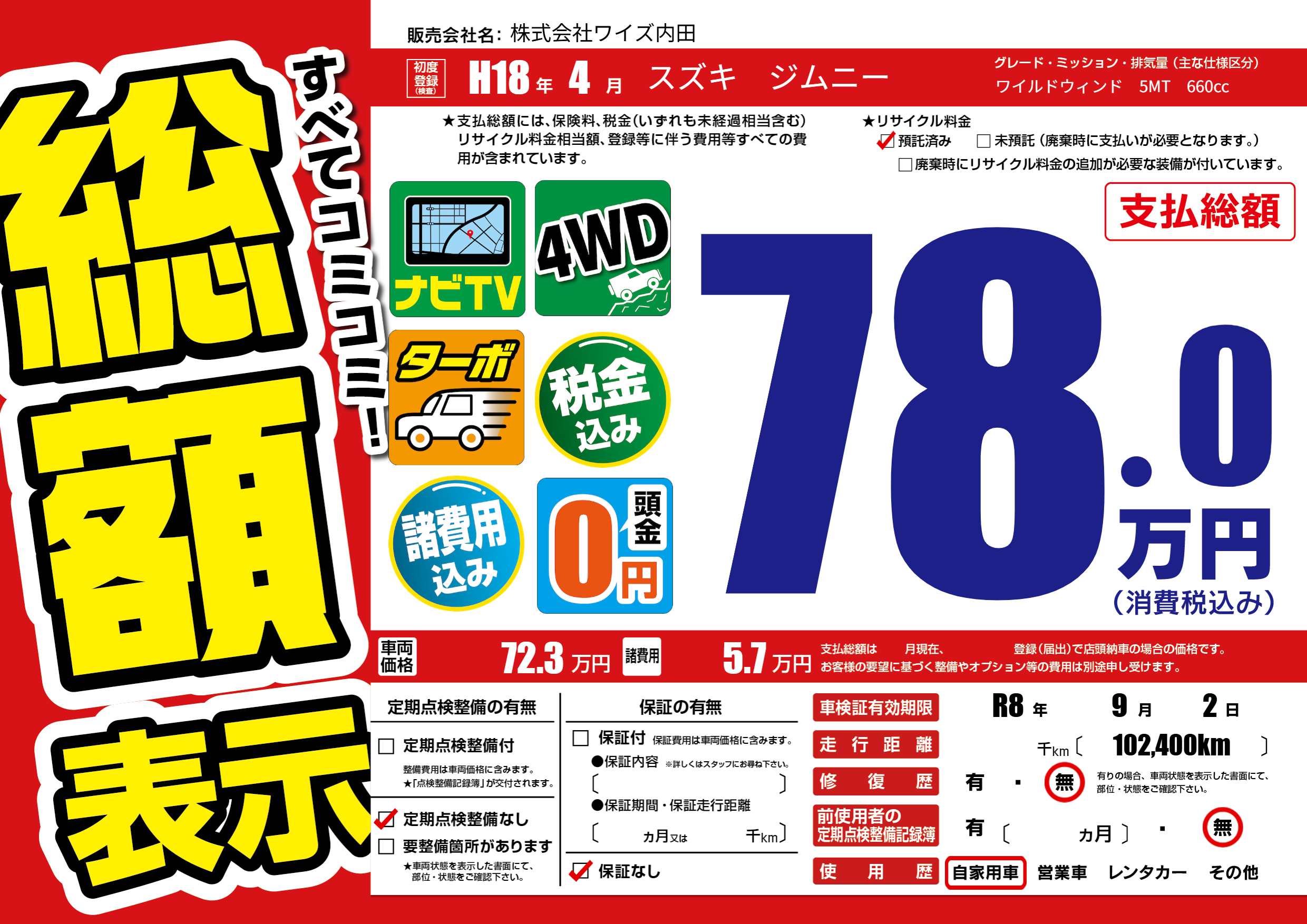 | 車名 | スズキ ジムニー | グレード ミッション 排気量 |