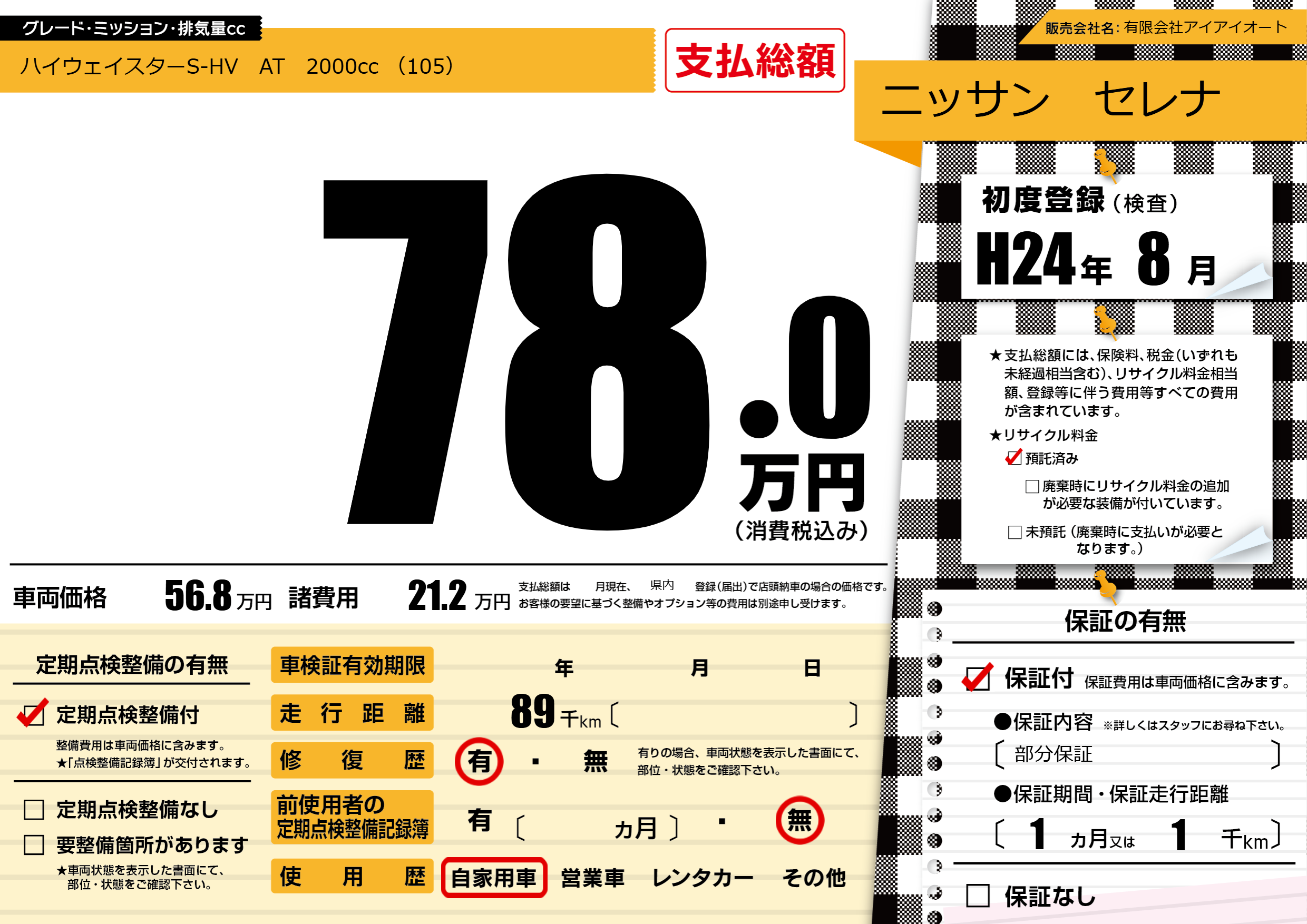 | 走行キロ | 8.9万km | 初年度登録 | H24年8月 |