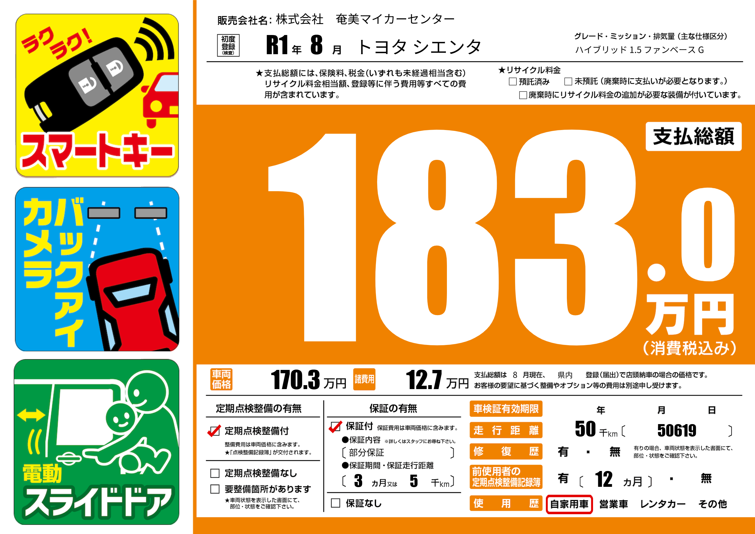 | 走行キロ | 5万km | 初年度登録 | R1年8月 |