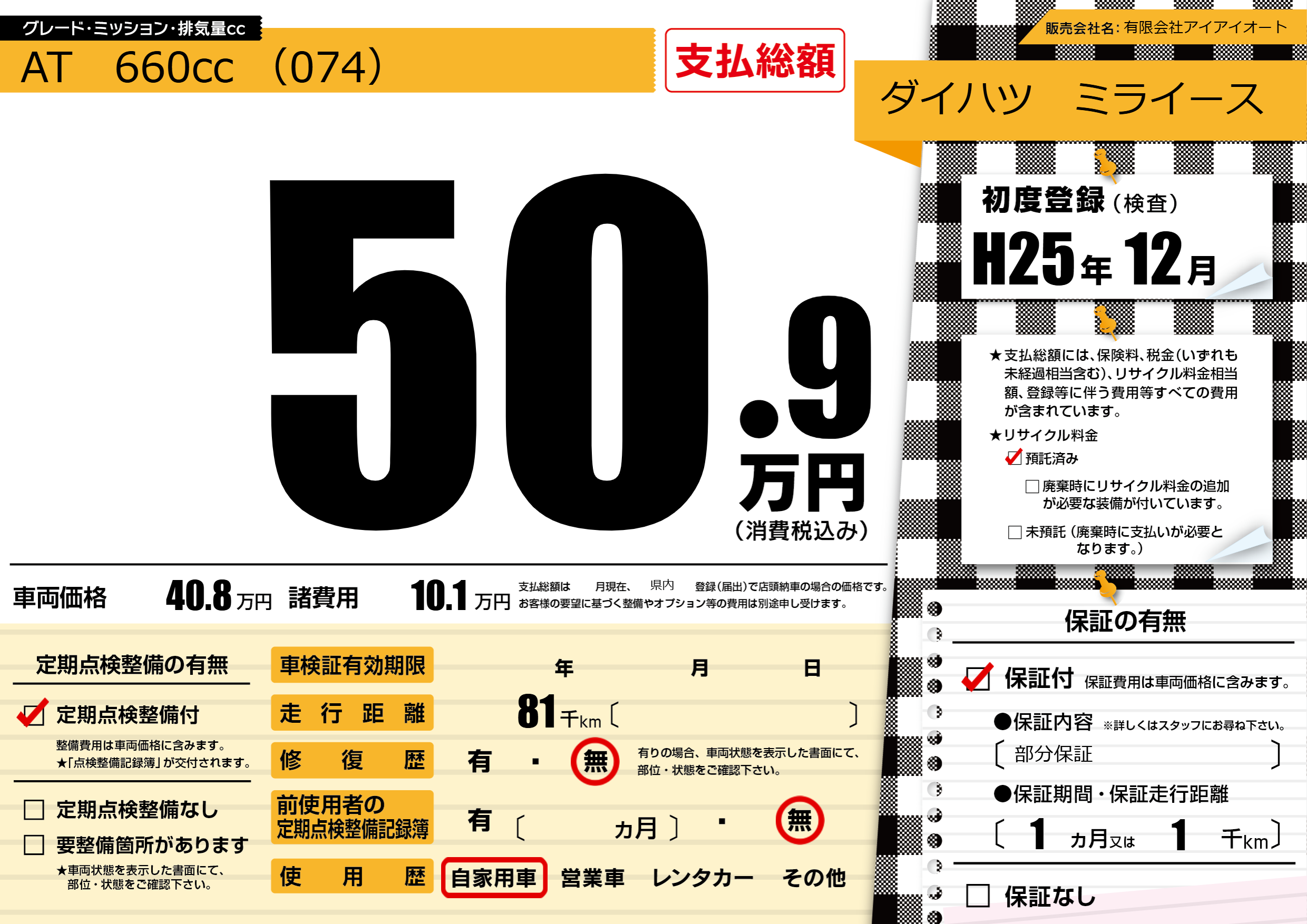 | 車名 | ダイハツ ミライース | グレード ミッション 排気量 |