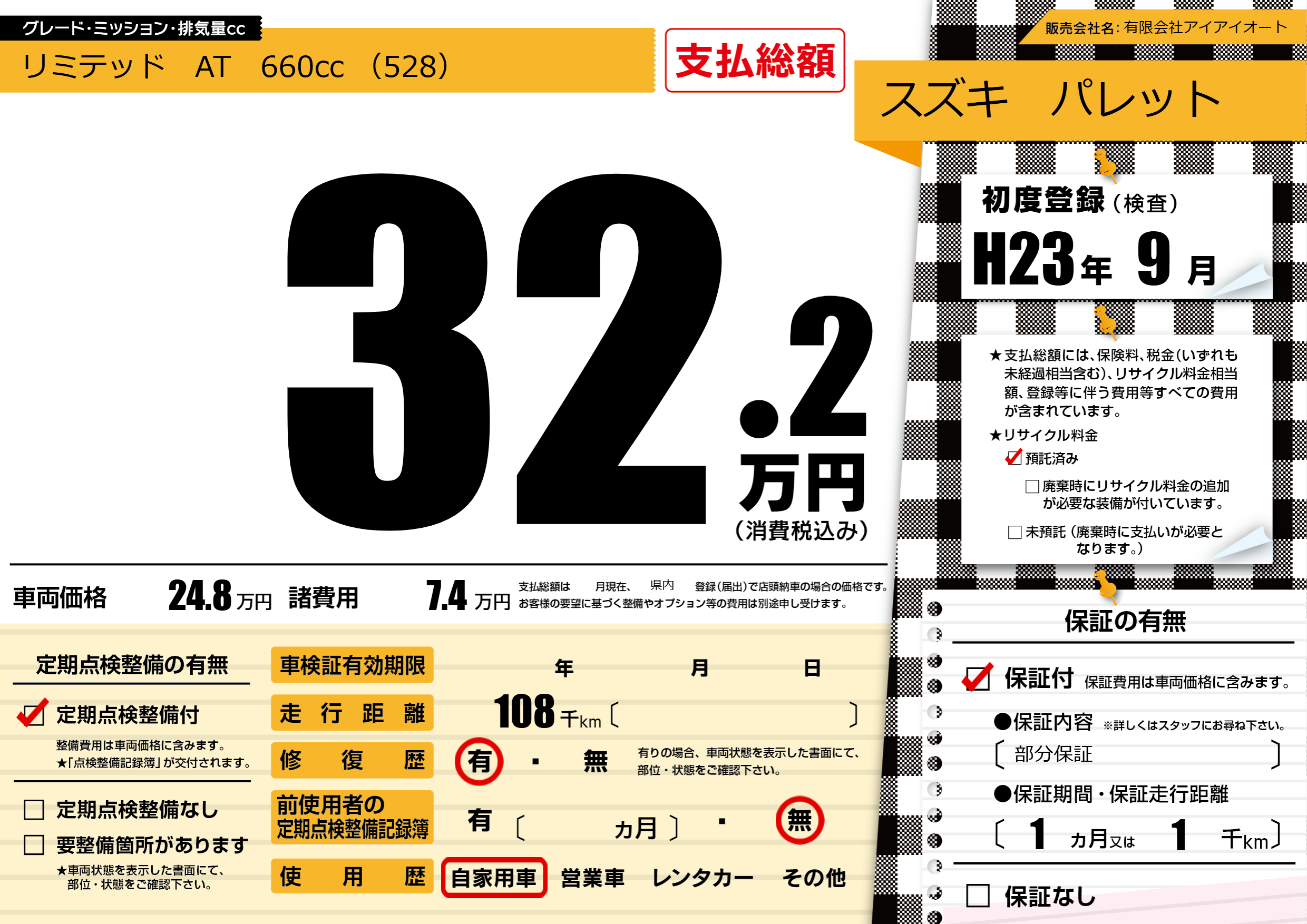 | 走行キロ | 10.8万km | 初年度登録 | H23年9月 |