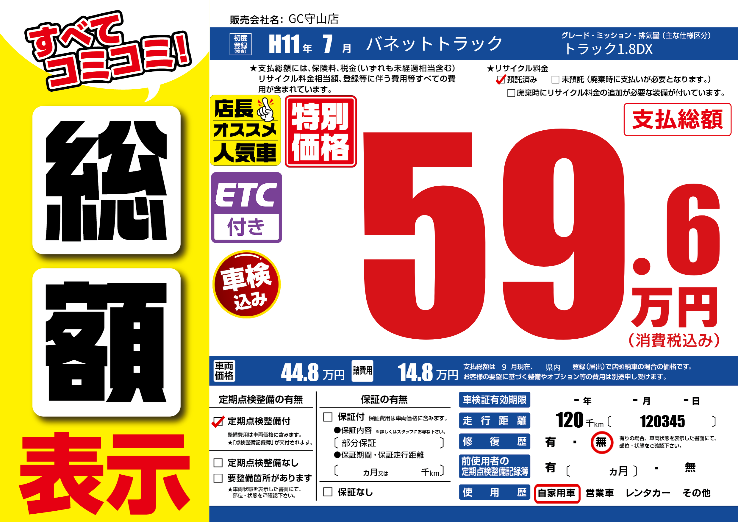 | 走行キロ | 12万km | 初年度登録 | H11年7月 |
