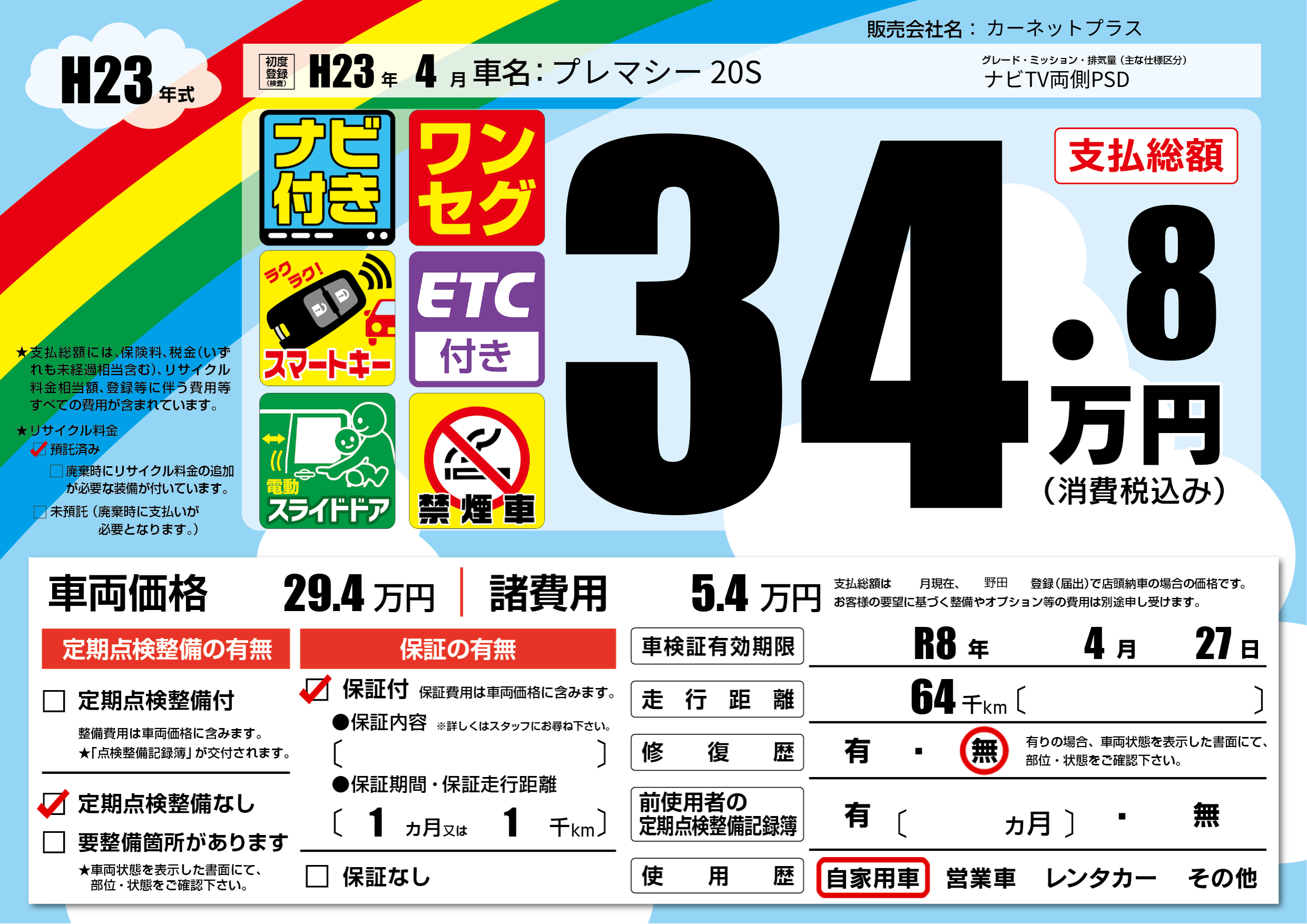 | 車名 | プレマシー 20S | グレード ミッション 排気量 |