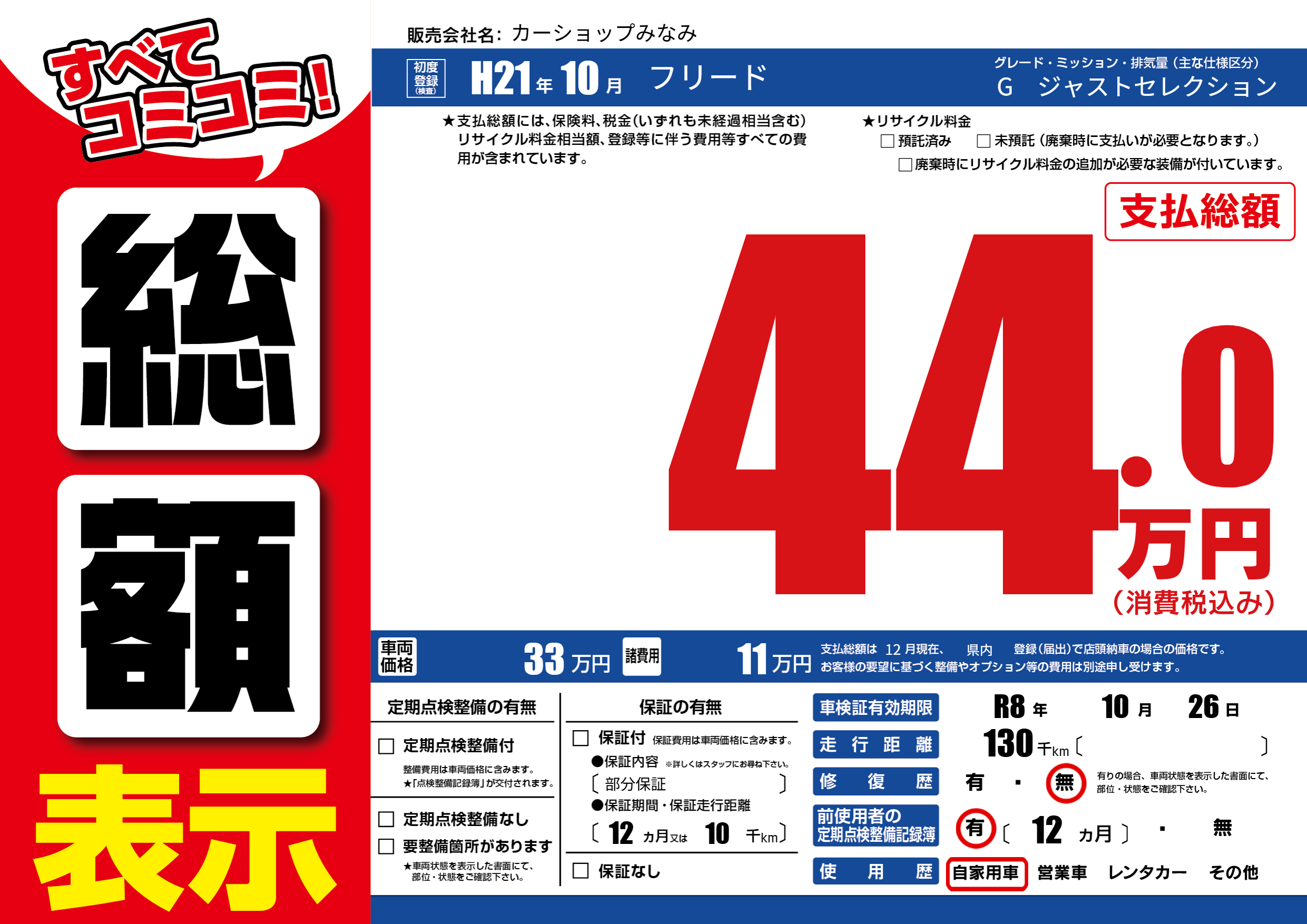 | 走行キロ | 13万km | 初年度登録 | H21年10月 |