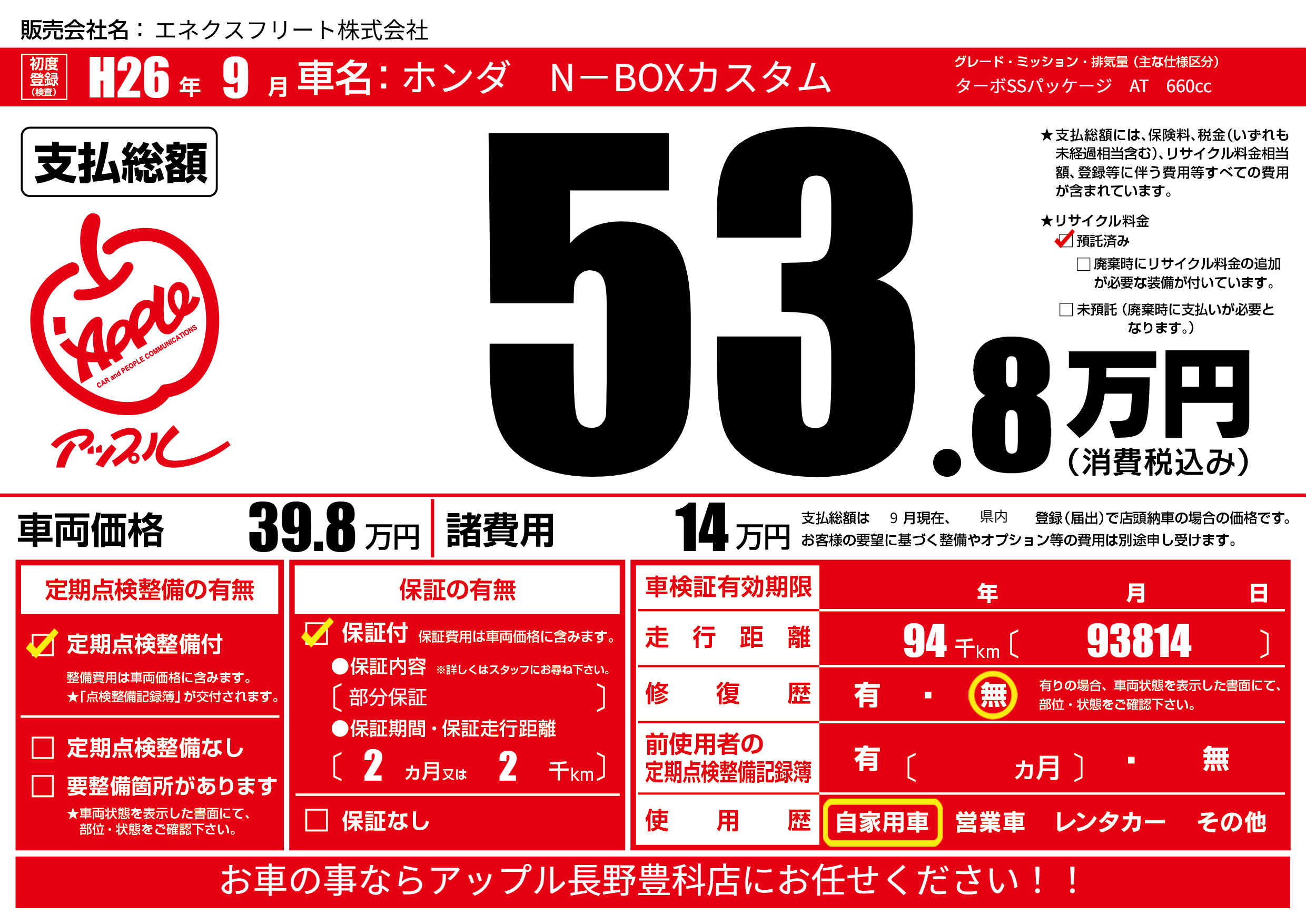 | 走行キロ | 9.4万km | 初年度登録 | H26年9月 |