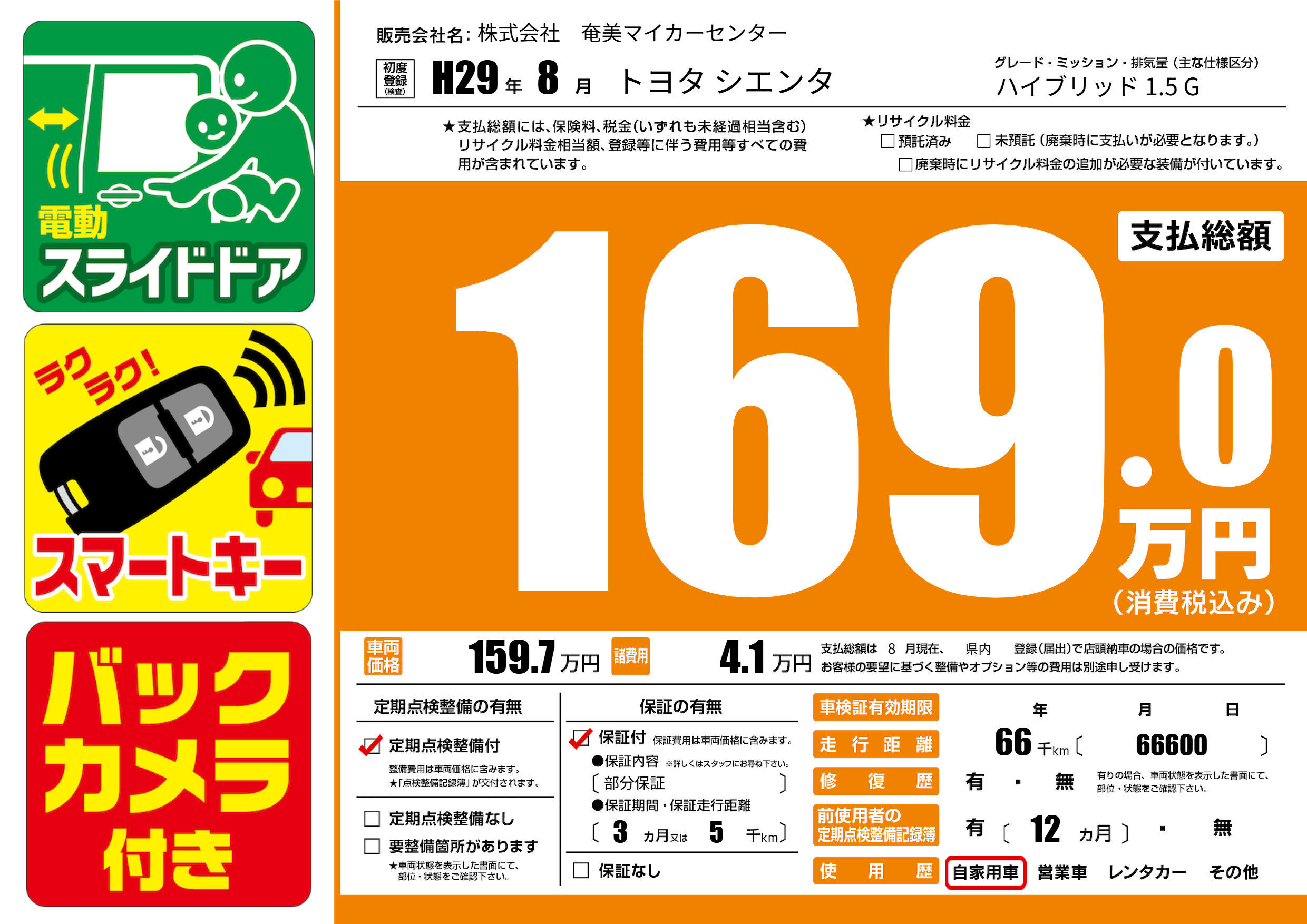 | 車名 | トヨタ シエンタ | グレード ミッション 排気量 |