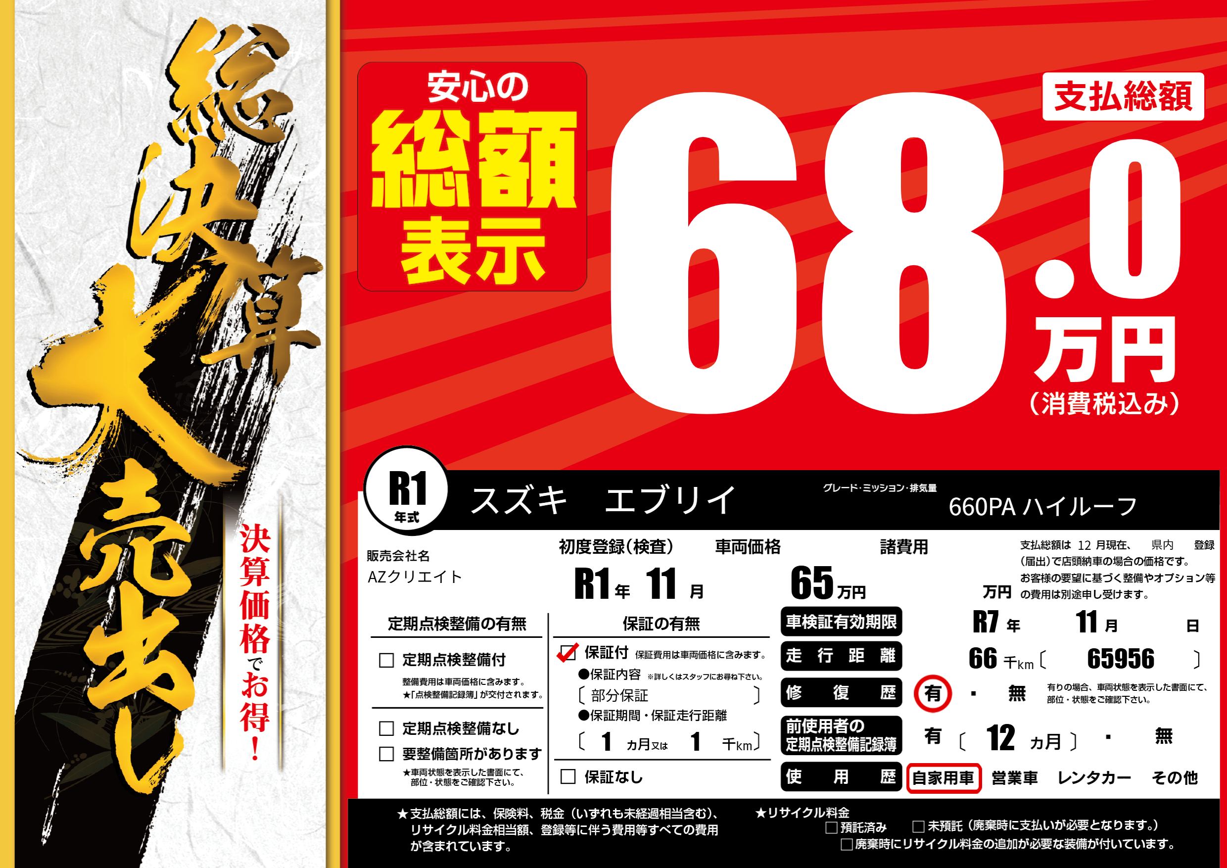 | 車名 | スズキ エブリイ | グレード ミッション 排気量 |