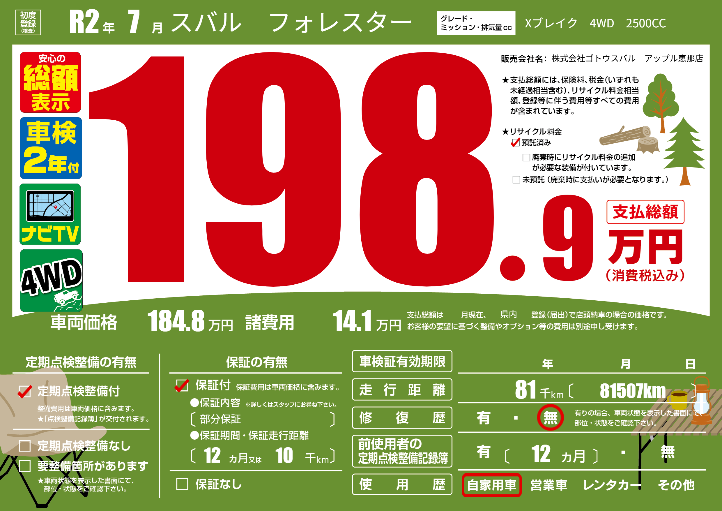 | 車名 | スバル フォレスター | グレード ミッション 排気量 |