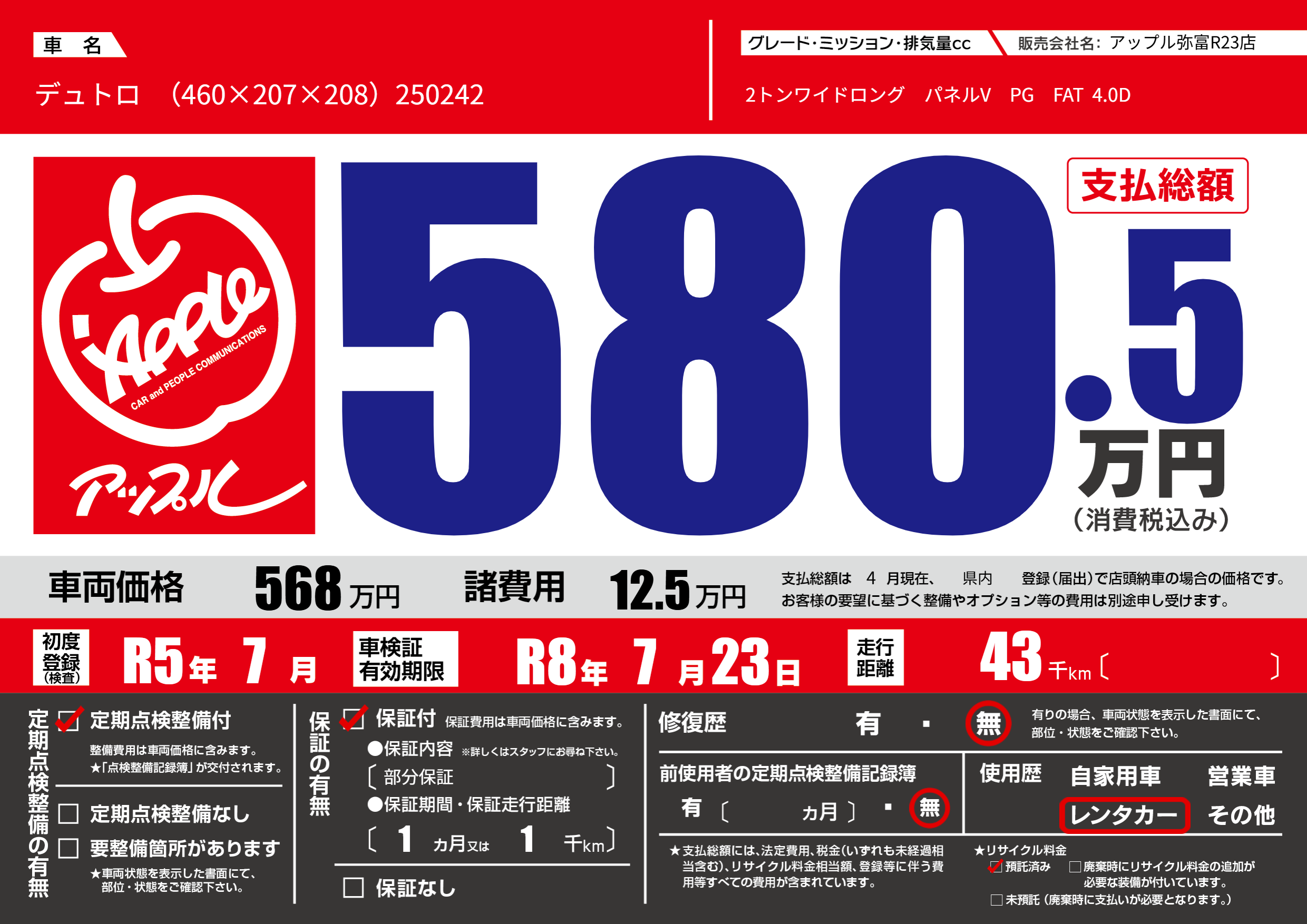 | 車名 | デュトロ (460×207×208)250242 | グレード ミッション 排気量 |