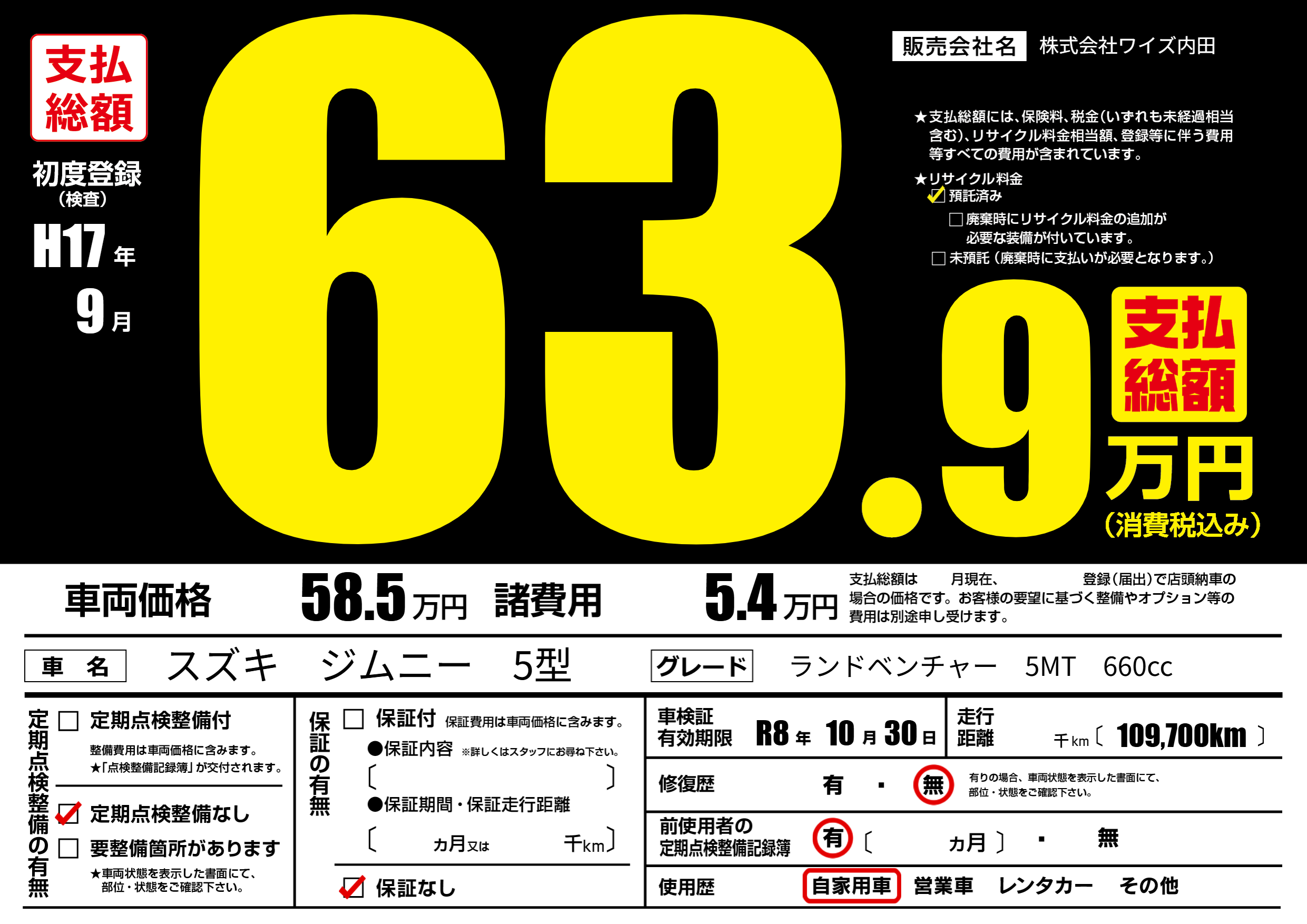 | 車名 | スズキ ジムニー 5型 | グレード ミッション 排気量 |