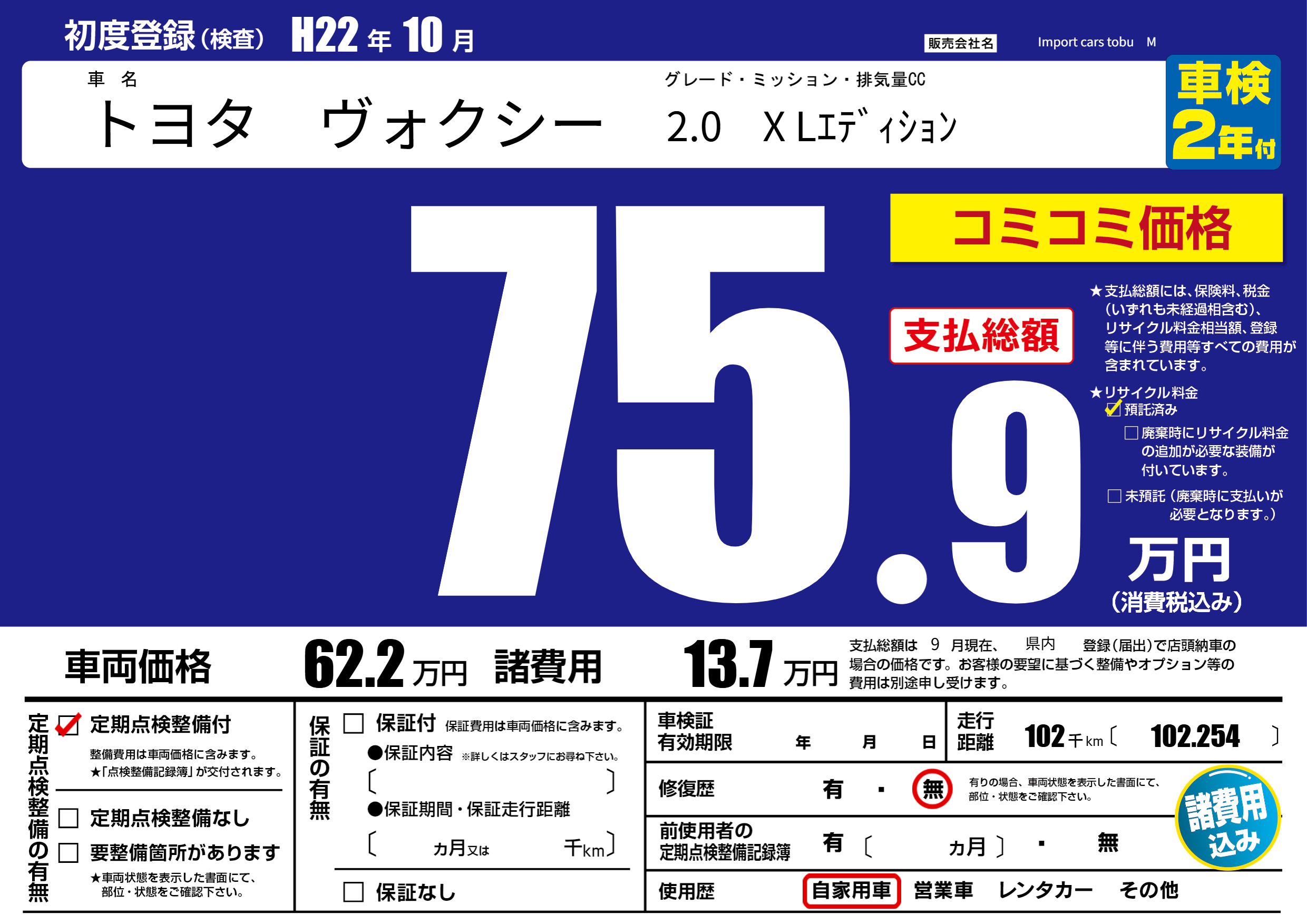 | 走行キロ | 10.2万km | 初年度登録 | H22年10月 |