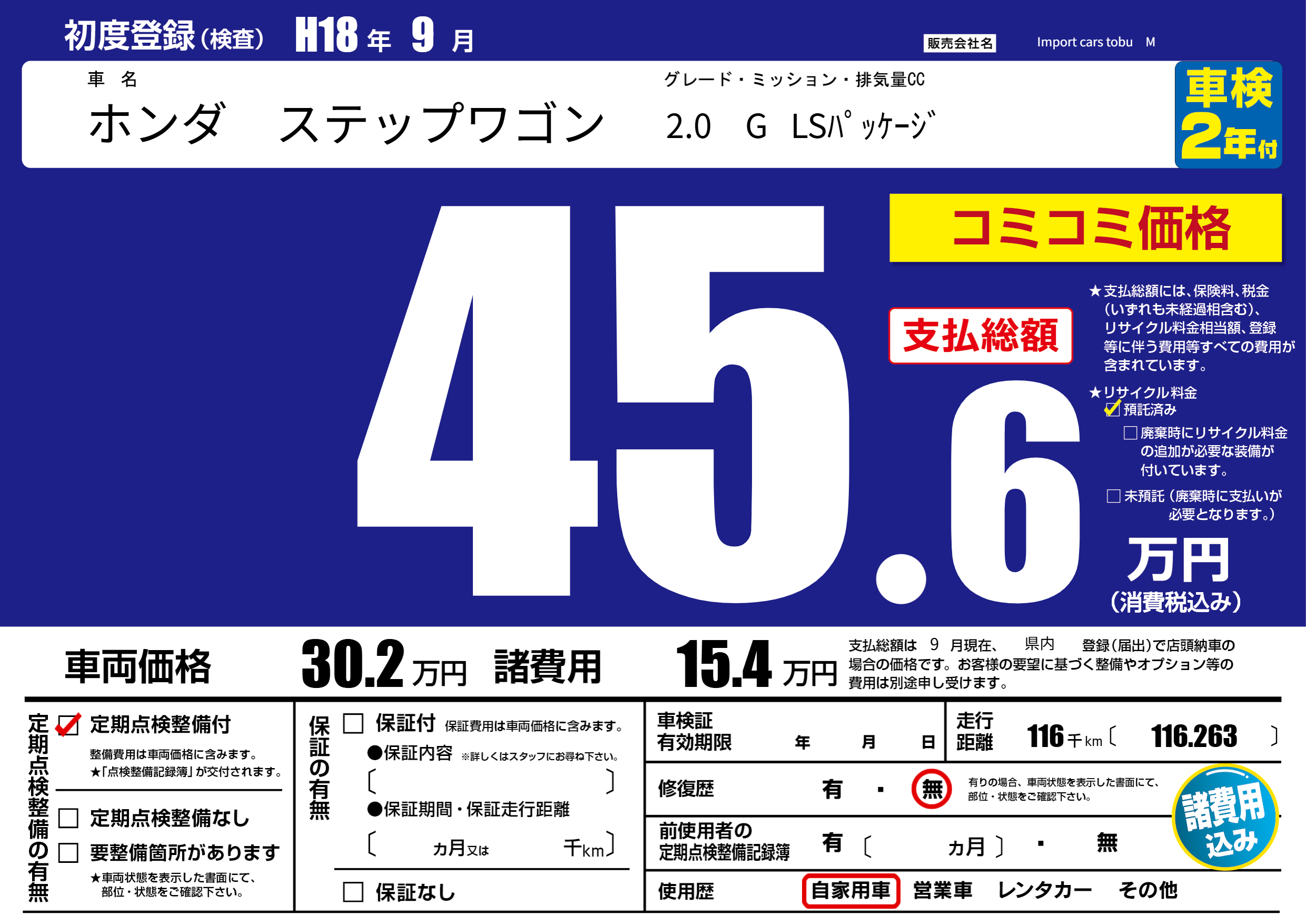 | 走行キロ | 11.6万km | 初年度登録 | H18年9月 |