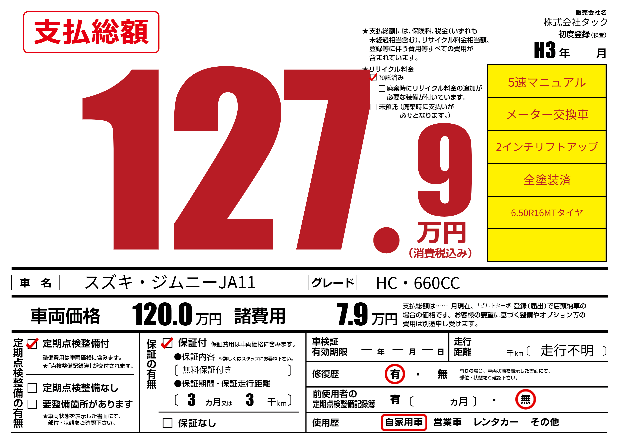 | 走行キロ | - | 初年度登録 | H3年---月 |