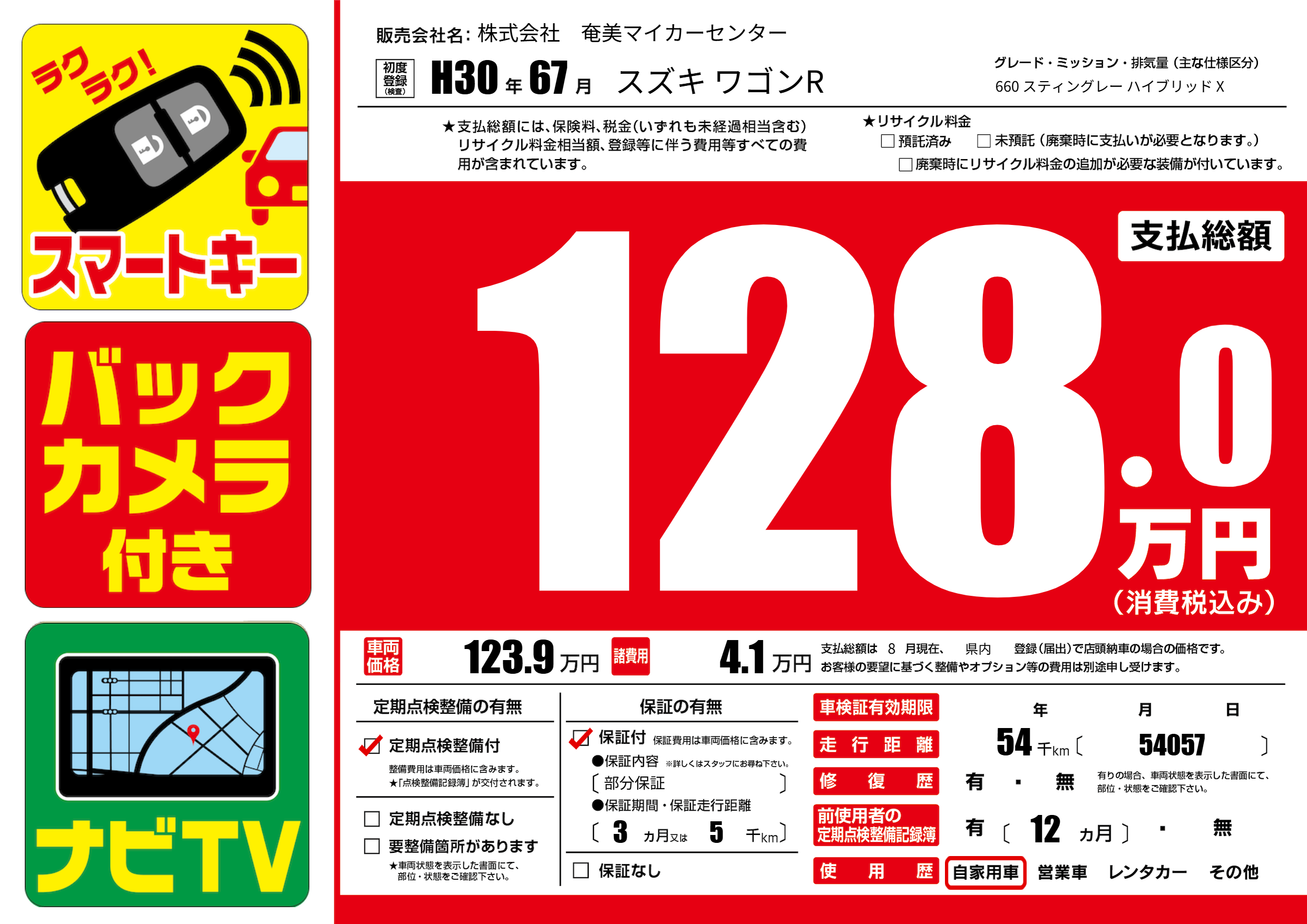 | 走行キロ | 5.4万km | 初年度登録 | H30年67月 |