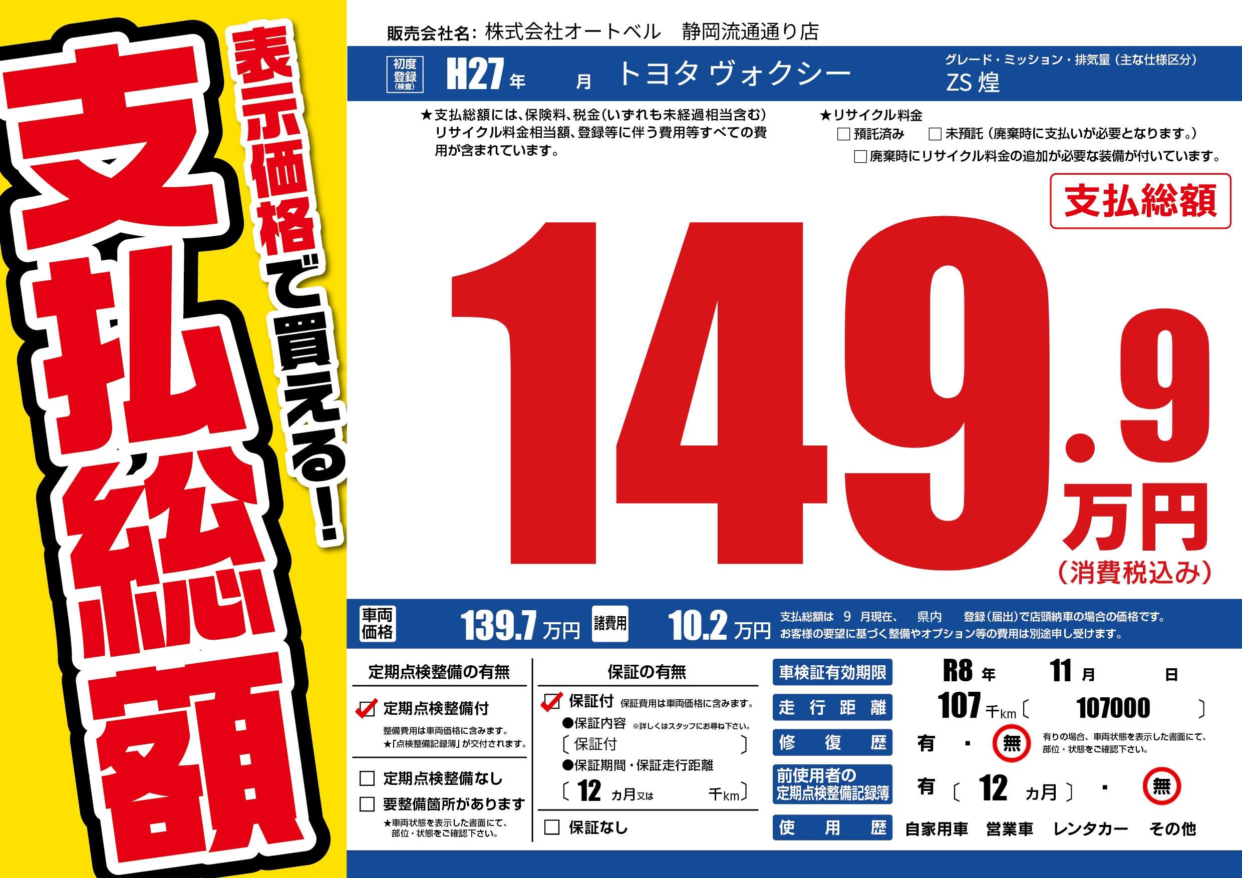 | 走行キロ | 10.7万km | 初年度登録 | H27年---月 |