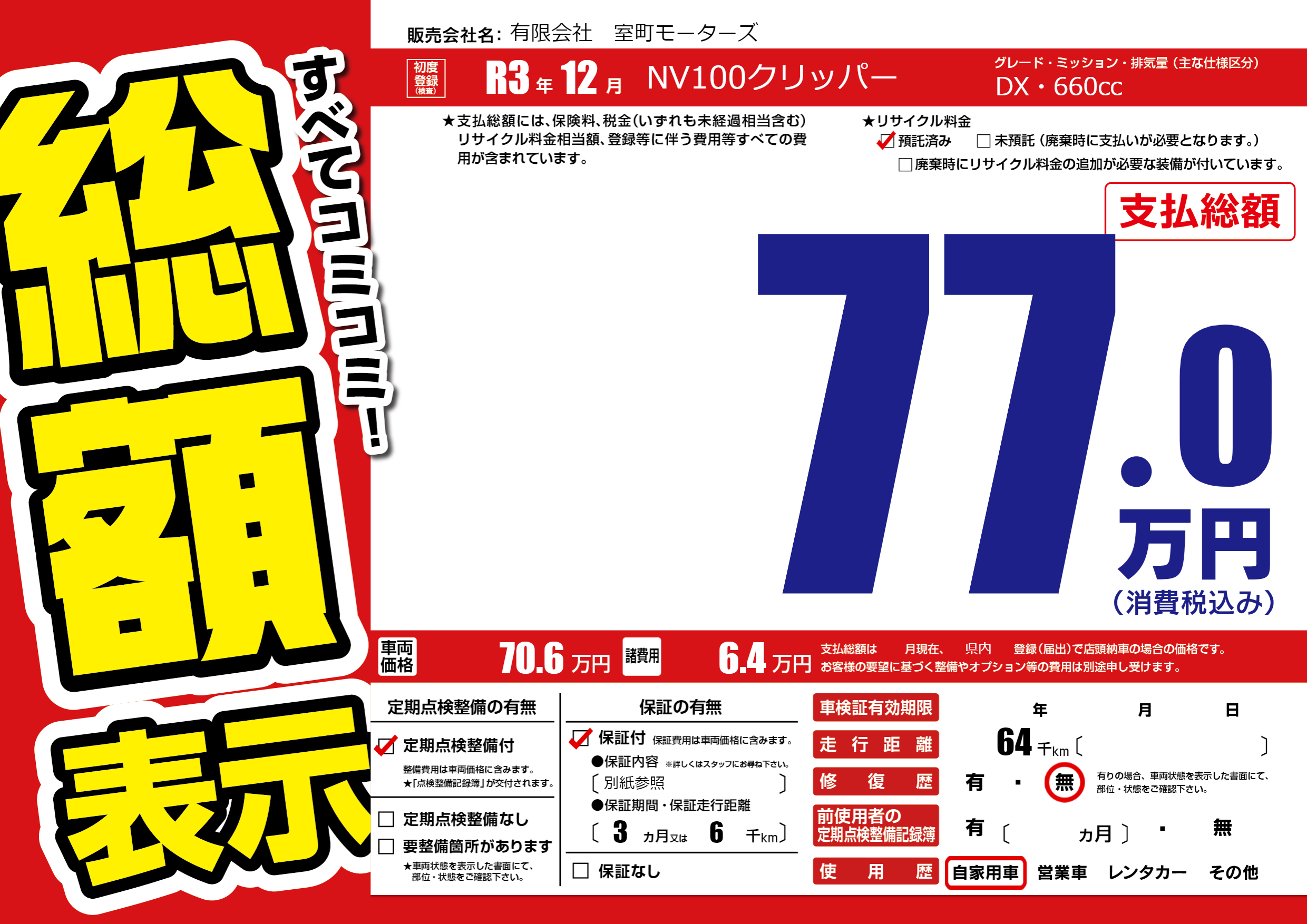 保証付き 保証内容(別紙参照) 3ヶ月または6千km |