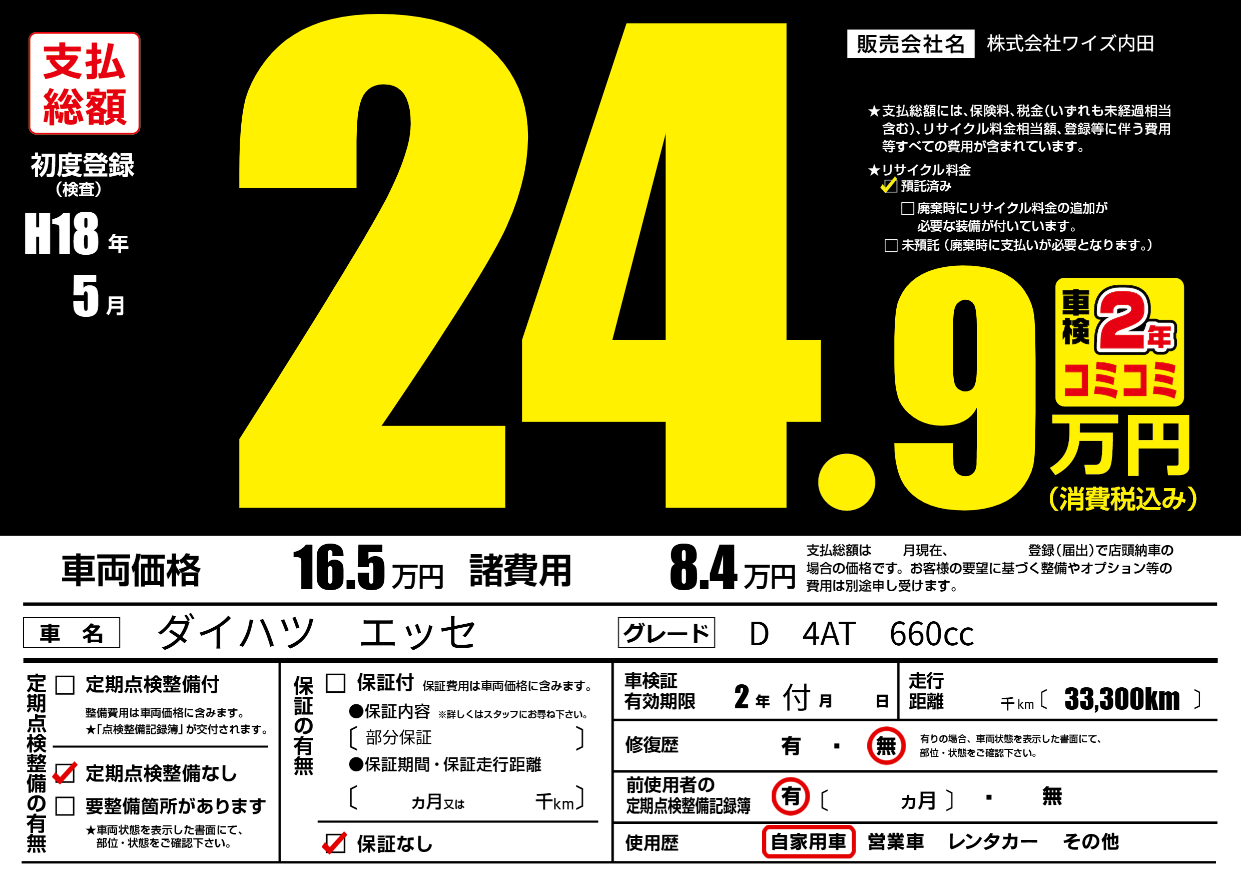 | 車名 | ダイハツ エッセ | グレード ミッション 排気量 |