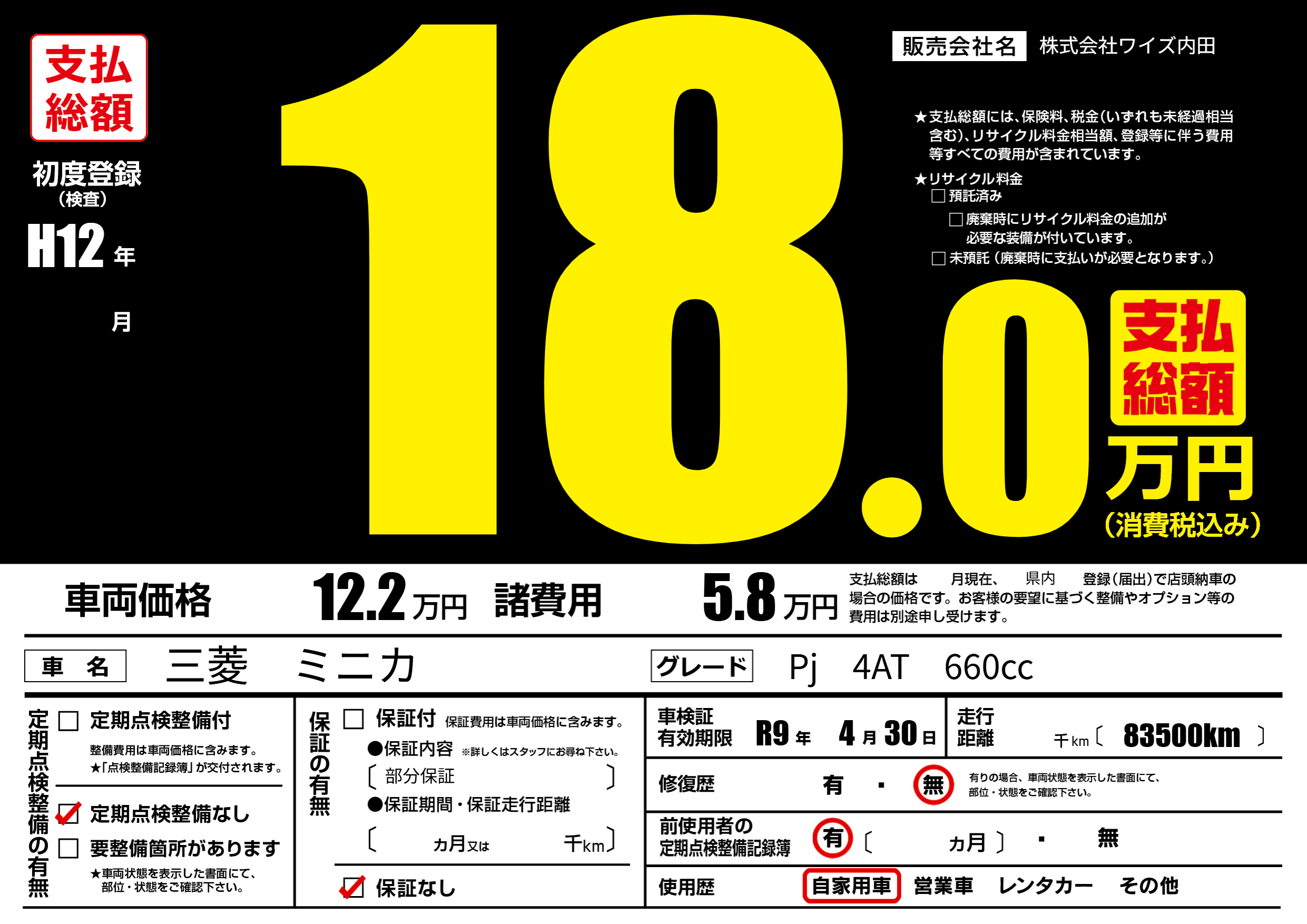 | 車名 | 三菱 ミニカ | グレード ミッション 排気量 |