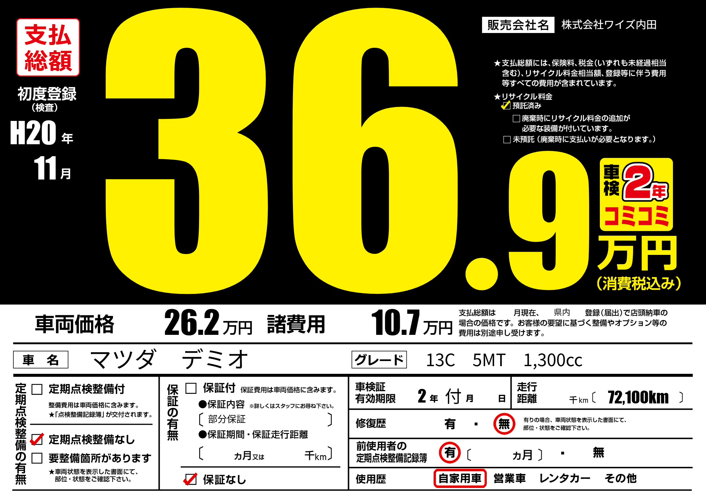 | 車名 | マツダ デミオ | グレード ミッション 排気量 |