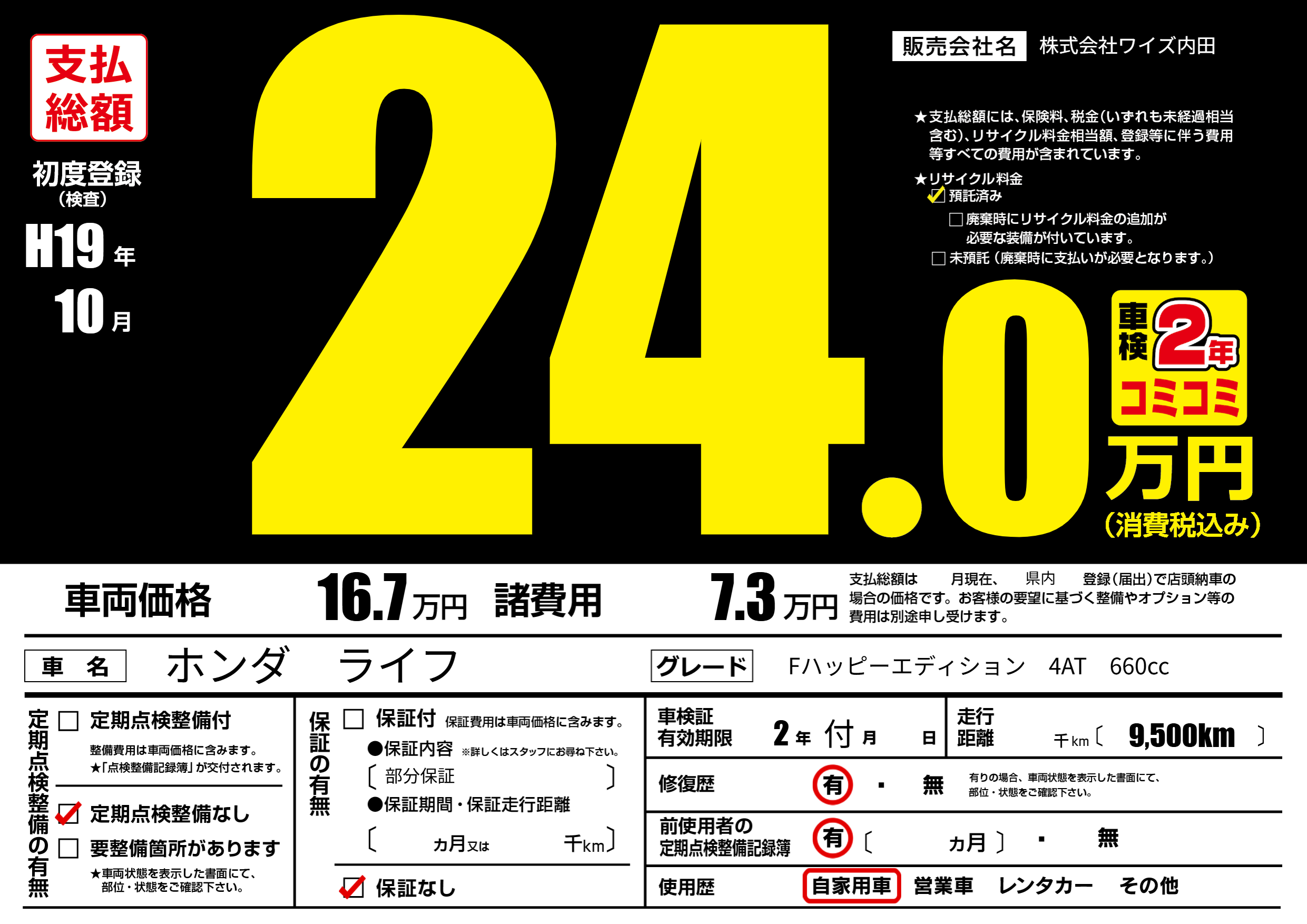 | 車名 | ホンダ ライフ | グレード ミッション 排気量 |