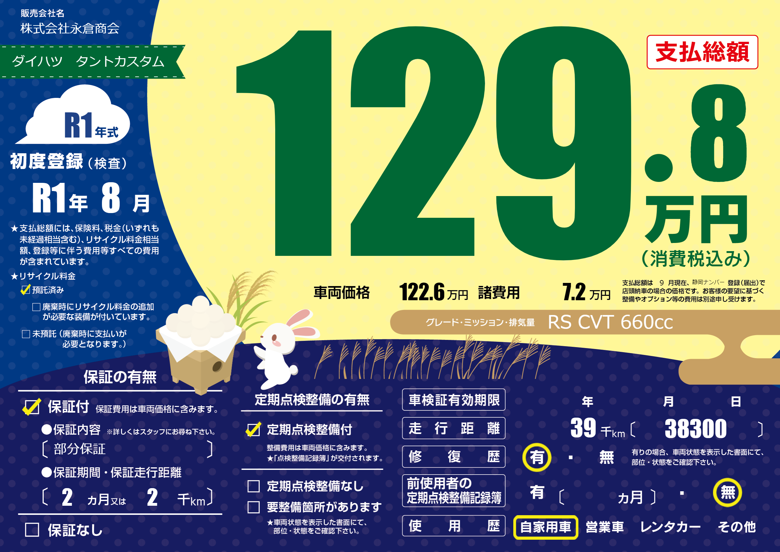 | 走行キロ | 3.9万km | 初年度登録 | R1年8月 |